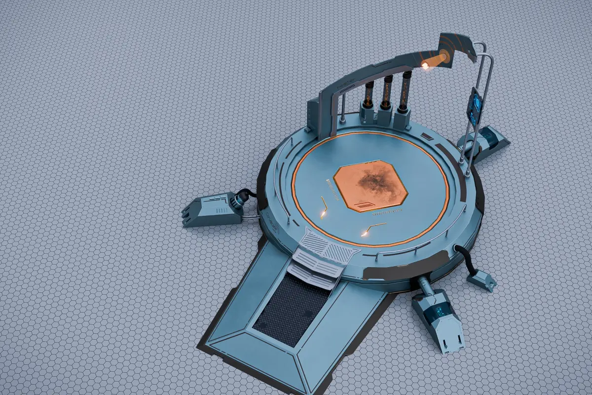 The teleport is one large piece. The set also includes smaller meshes like batteries, turbines, datapads etc. as well as details such as nuts and decorative modules. The asset was made in Blender and optimized for gaming. The mesh has been reduced to be more lightweight and still produce clean shading.