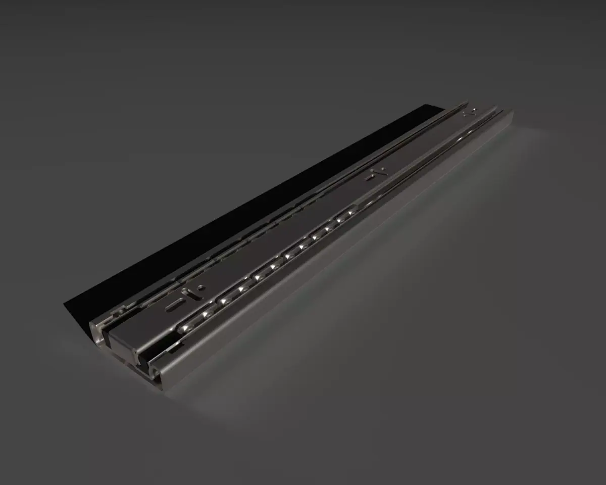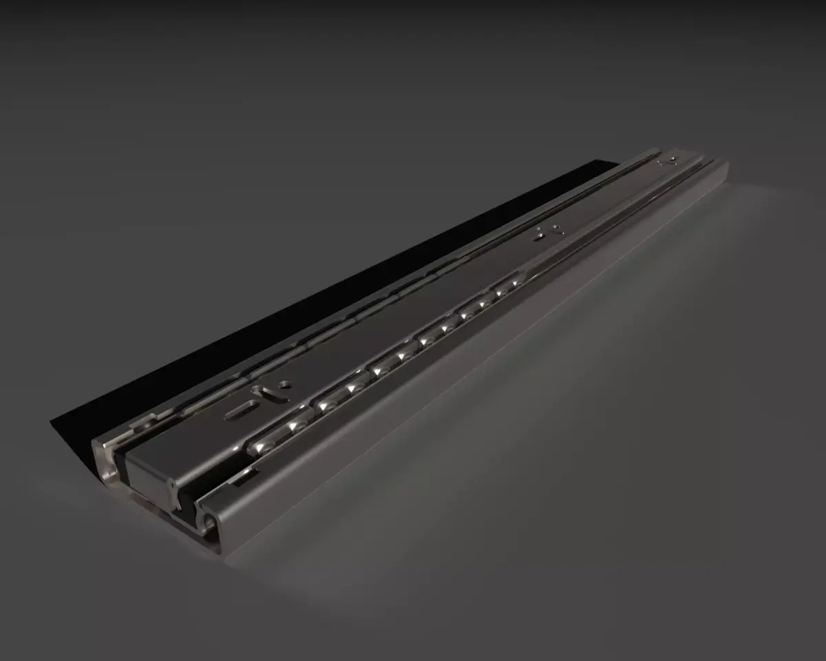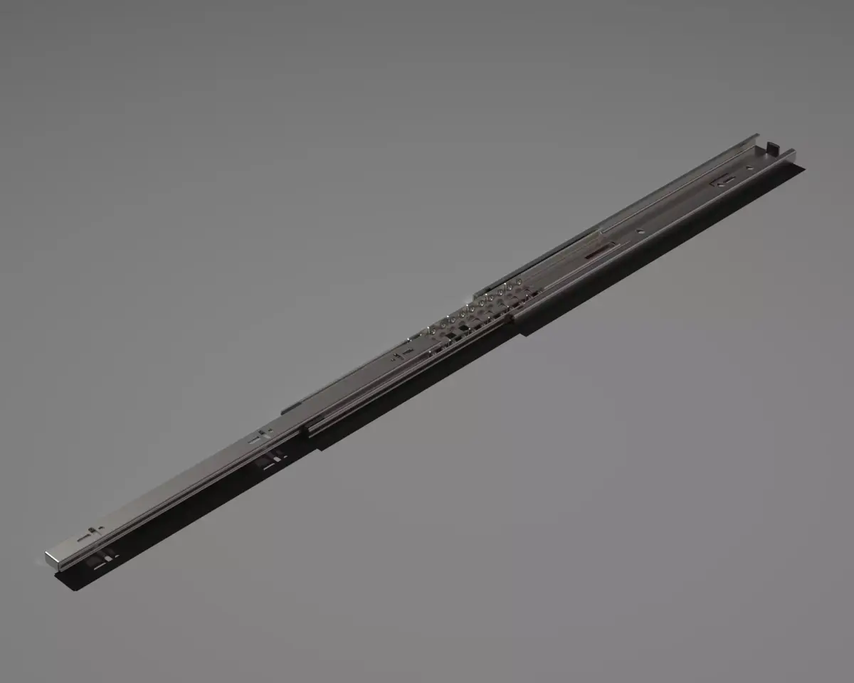 A professionally built 3D CAD model of telescopic drawer slides designed for industrial and furniture hardware applications. The assembly includes all functional components: outer rail, intermediate rail, inner rail, ball‑bearing cages, stops, and mounting features. Geometry is clean, accurate, and suitable for both technical and visual use cases.