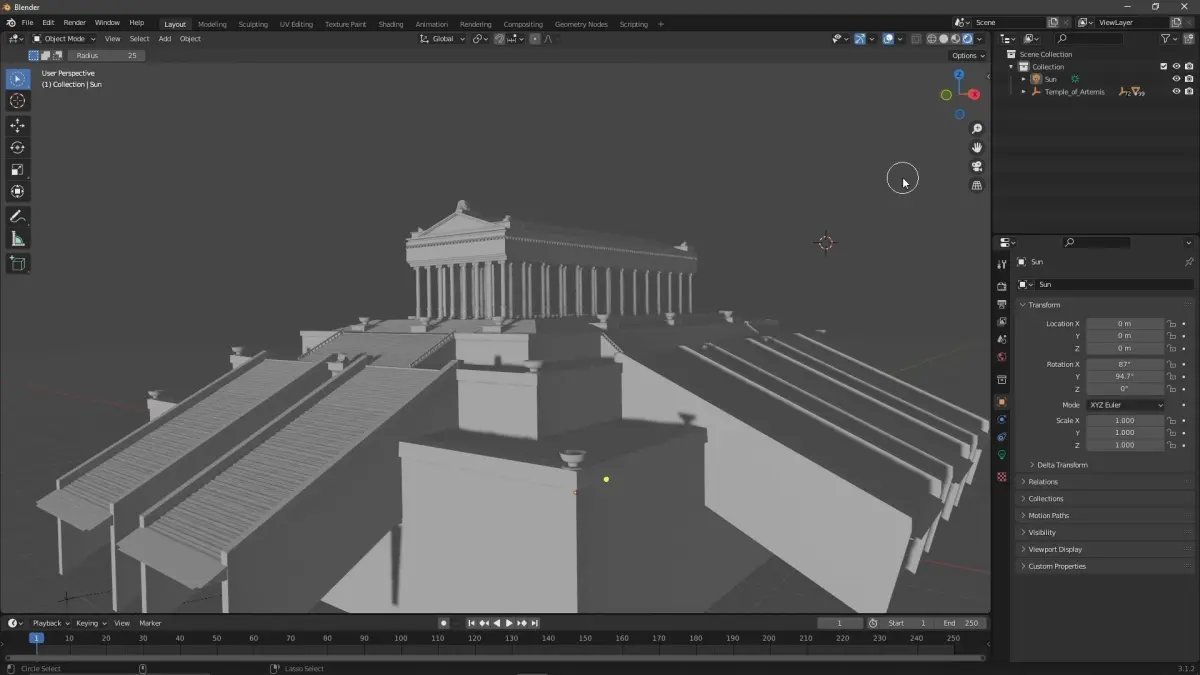 3D Model of the Temple of Artemis: This representation is based on ancient records and blueprints to achieve accurate proportions and layouts for the temple. In cases where details were ambiguous or missing, I turned to the rich mythology surrounding the goddess Artemis for inspiration.
