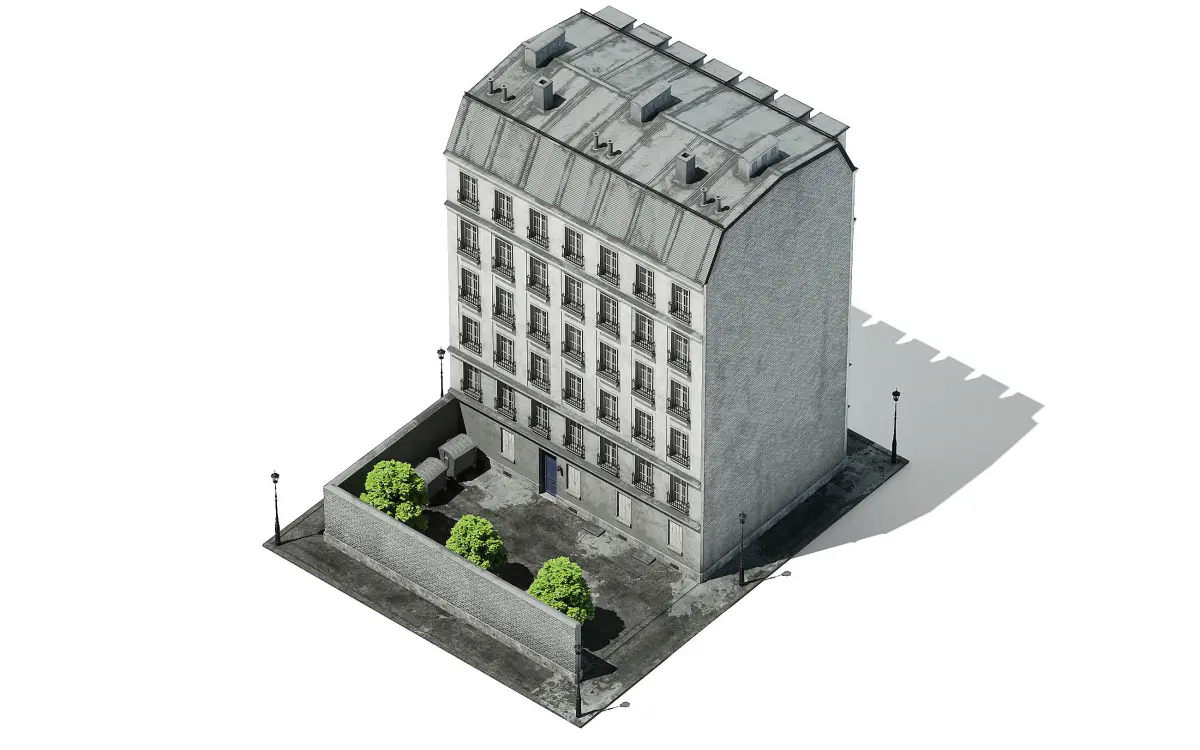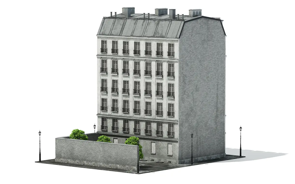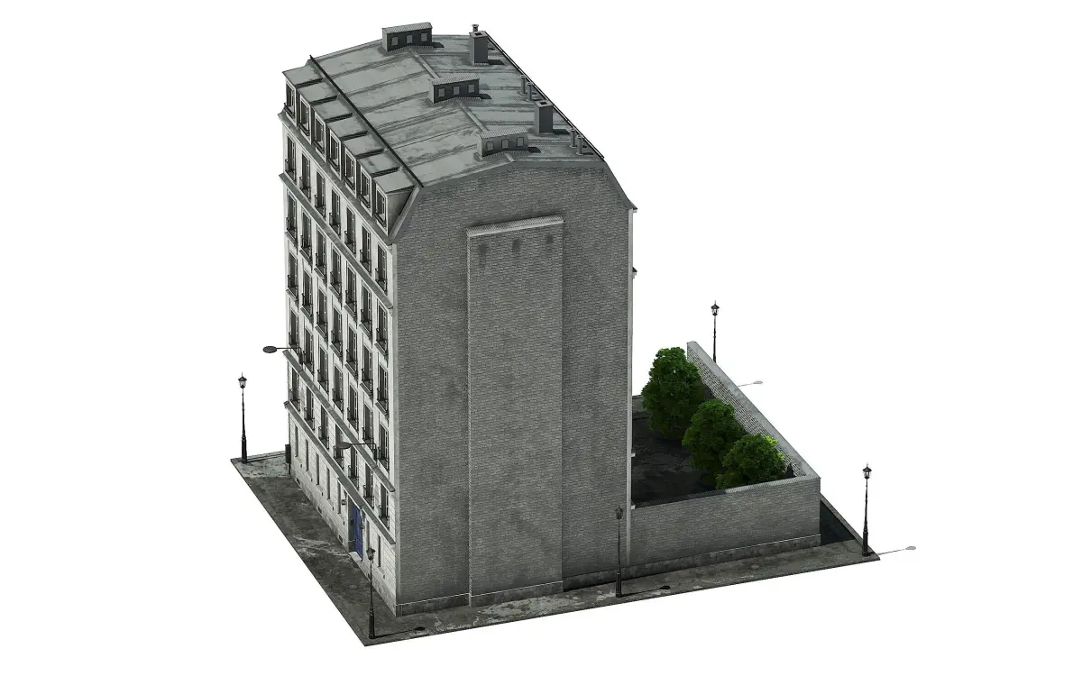 Tenement building with 7 floors, backyard, street lamps, trees and pathway around it. All objects in this 3d model have non-overlapping UV with 8192x8192 textures. Along with it you will get 29 tileable PBR materials used to creating its textures.