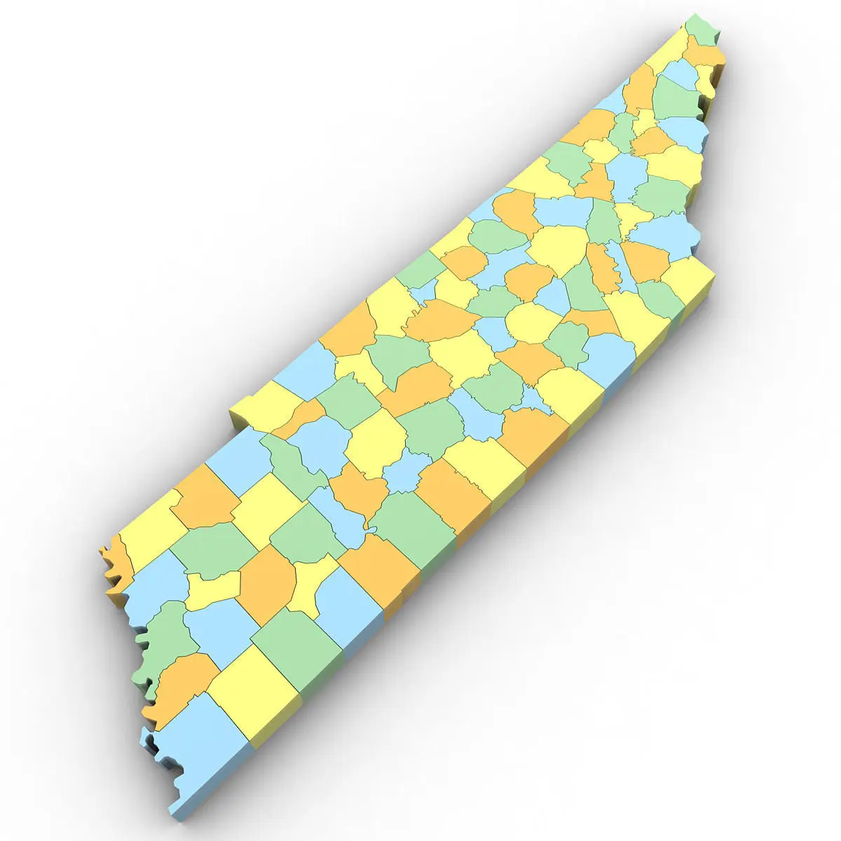 3d Model of the Political Map of Tennessee. Features every county in the state. The modifier stack is uncollapsed allowing for easy change of extrusion settings.