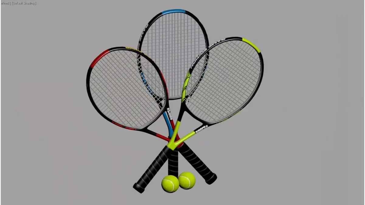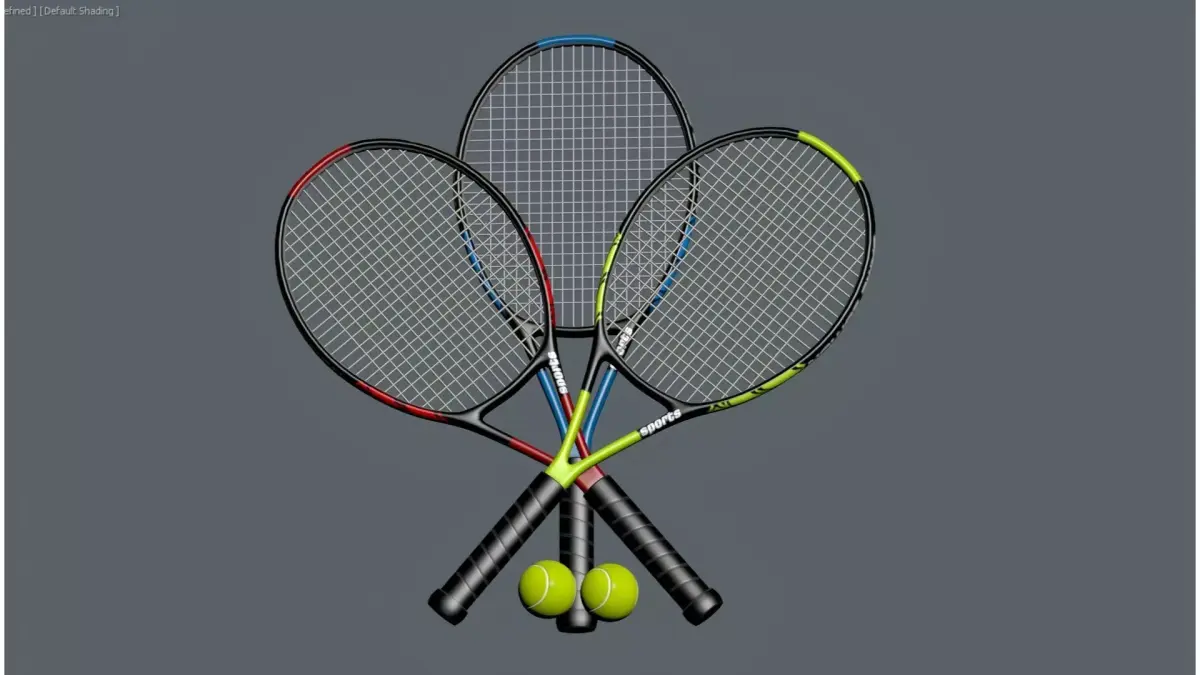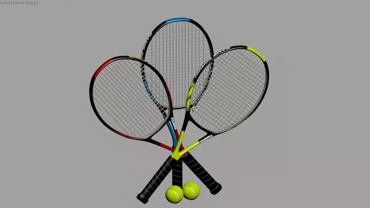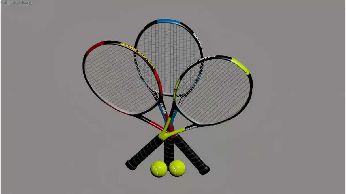 This is a set of display images of colorful tennis equipment: three stylishly designed tennis rackets (featuring contrasting color elements such as red, blue, and neon green) are placed crosswise, with the sports logo printed on the racket bodies, and two classic yellow tennis balls paired below. The overall style is fresh and eye-catching, highlighting the vitality and practicality of the tennis equipment. It is suitable for sports goods promotion, sports-themed scene matching, and other purposes.