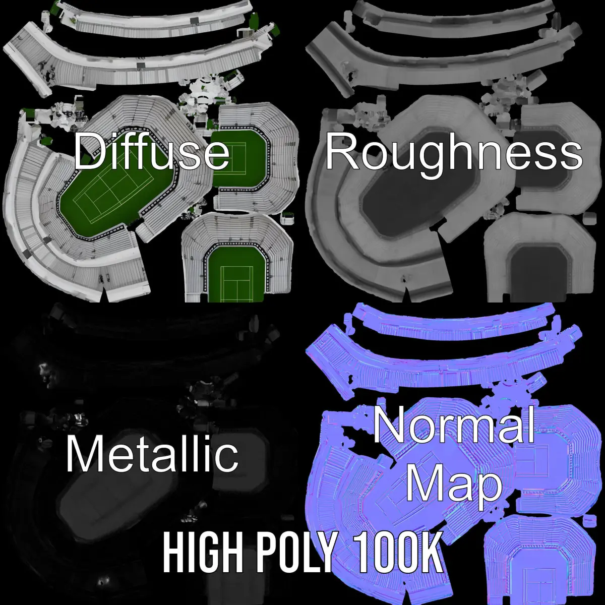 This Tennis Stadium Arena 3D Model Pack is perfect for creating realistic sports environments, architectural visualizations, and virtual reality experiences. Each model includes three levels of detail (LOD): low-poly for mobile platforms, mid-poly for detailed environments, and high-poly for production rendering, ensuring compatibility with game engines like Unity and Unreal. The model features PBR textures, including diffuse, normal maps, and reflection/roughness/metallic, all at a 4096*4096 resolution, providing pristine quality for modern rendering engines. It has accurately unwrapped UVs with no overlapping. Ideal for projects needing a high-quality stadium setting, from video games to interactive presentations. The first image is the reference used for creating the 3D model. It is important to carefully evaluate the quality of the model by examining the preview images that display the topology and polygonal mesh. These previews (WIRE and WEB 3D Preview) clearly demonstrate how accurately the model matches the original reference and how well the geometry has been executed. If you find this model helpful, please like and leave a comment!