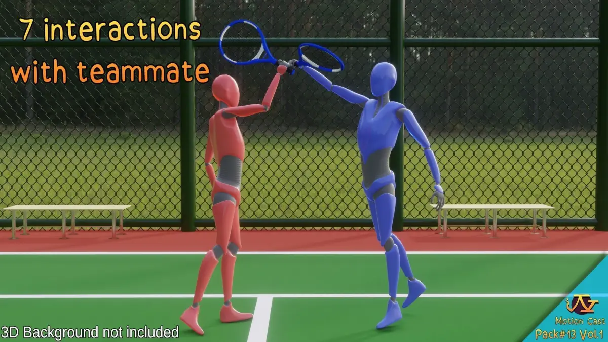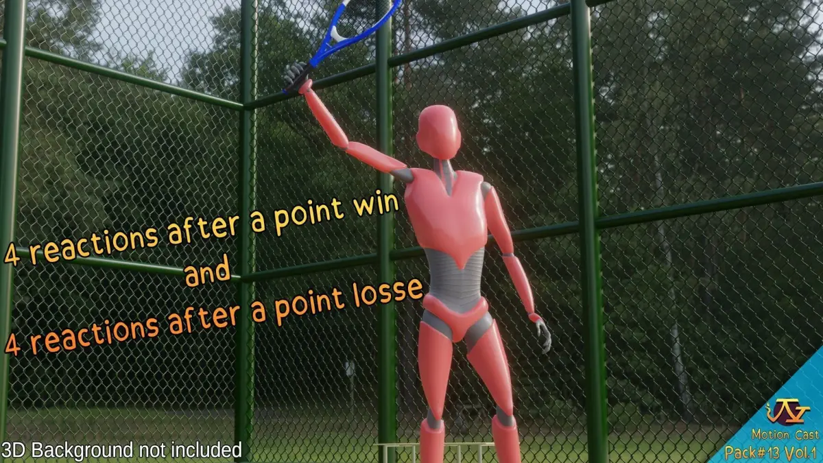 List of animations :-1 animation where the player arrives on the field-1 warm-up animation-1 IDLE animation-10 animations of the player moving in different directions and at different speed-1 ball bounce animation before the serve-3 service animations-18 animations of shooting from the spot at various speed-6 animations of shooting preceded by a run in various directions-4 animations of drop shot-4 animations of backhand slice-3 smash animations-1 shot between the legs-4 reactions after a won point-4 reactions after a lost point-7 interaction with the teammate