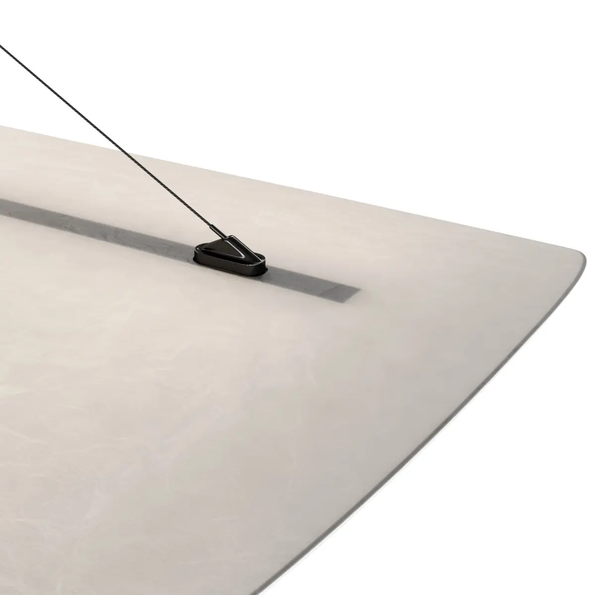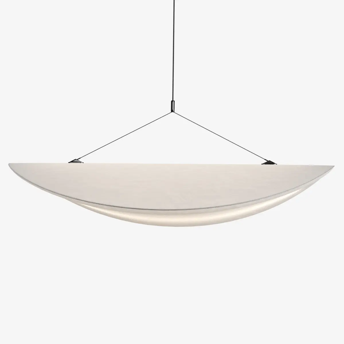 The Tense pendant light features a soft diffuser made from Tyvek, a material known for its durability and softness. Notably, Tyvek is also 100% recyclable, reflecting the lamp's eco-friendly nature. The diffuser's paper-like texture allows for flexibility, enabling the slim frame of the pendant lamp to accentuate its cloud-like qualities. The result is a captivating and dreamy visual experience when the light emanates through the diffuser.