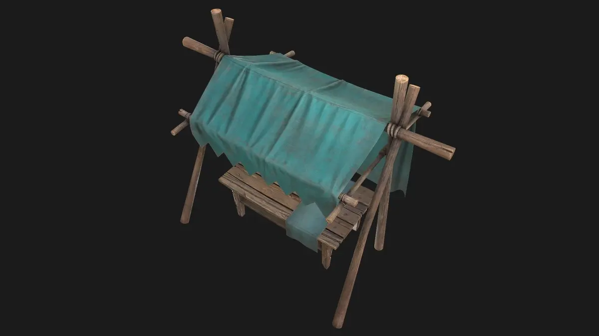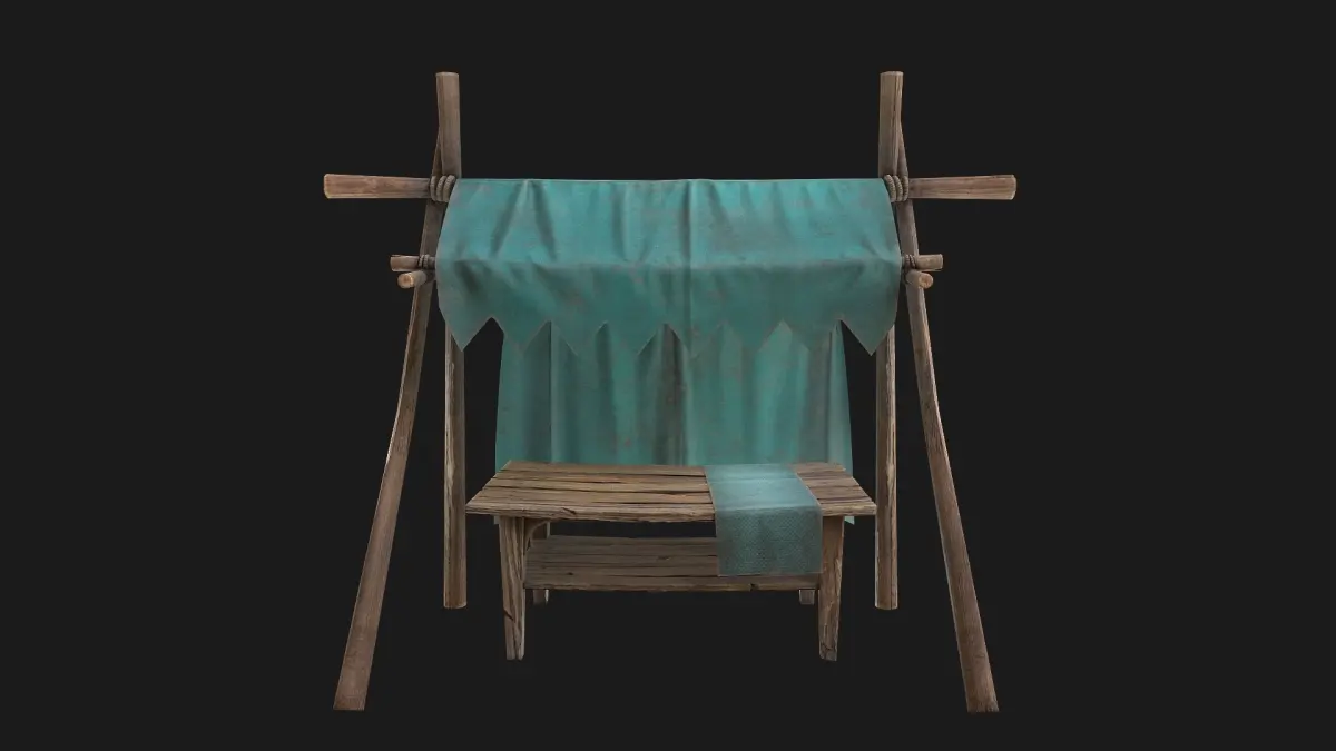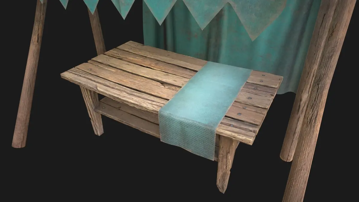 Game ready model. Market Stalls fully textured, sculpted and rendered with Physical based rendering (PBR) - Shown images have been rendered in Marmoset Toolbag .The models contains lods, detailed information on the images.The model consists of two UV Maps :Table(4096x4096),Tent(4096x4096).