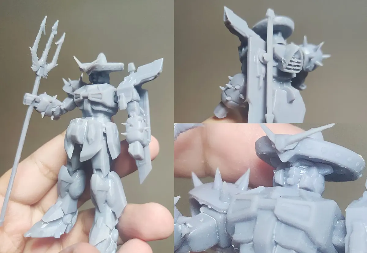 It was tested on a resin printer (Elegoo Mars 2 Pro) on a small scale (about half the height of an HG gunpla kit) but it was designed to be able to be printed larger, 1/144 or even 1/100 scale.