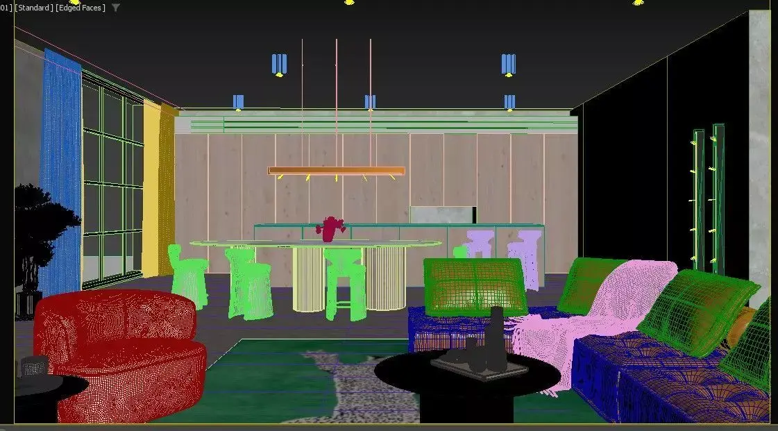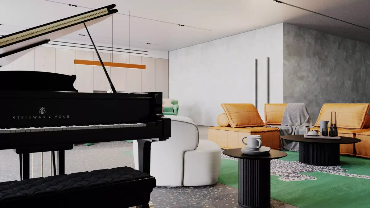 DESIGN AND MATERIAL FOCUSThe scene delivers a dynamic blend of color contrast and modern textures: