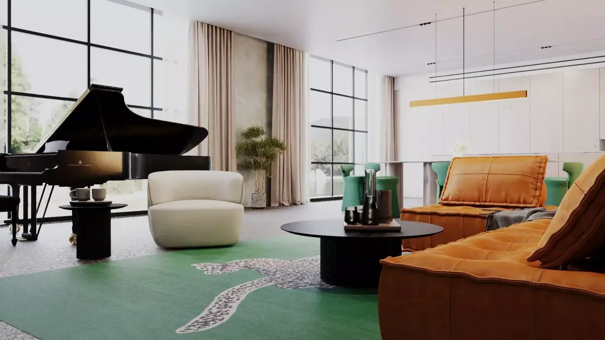 High-Quality Assets: Includes detailed, realistic models for the sectional burnt orange leather sofa, cream accent chair, emerald green dining chairs, large oval dining table, and minimalist coffee table.