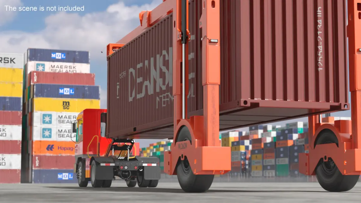 Terminal Carrier Truck Ottawa T2E with Container 40FT is a three-dimensional model of Kalmar Ottawa T2E Electric Terminal Tractor with a hydraulic yard container frame (hydraulic lift semi-trailer, container mover semi-trailer, intermodal transport semi-trailer, or terminal tractor straddle frame).