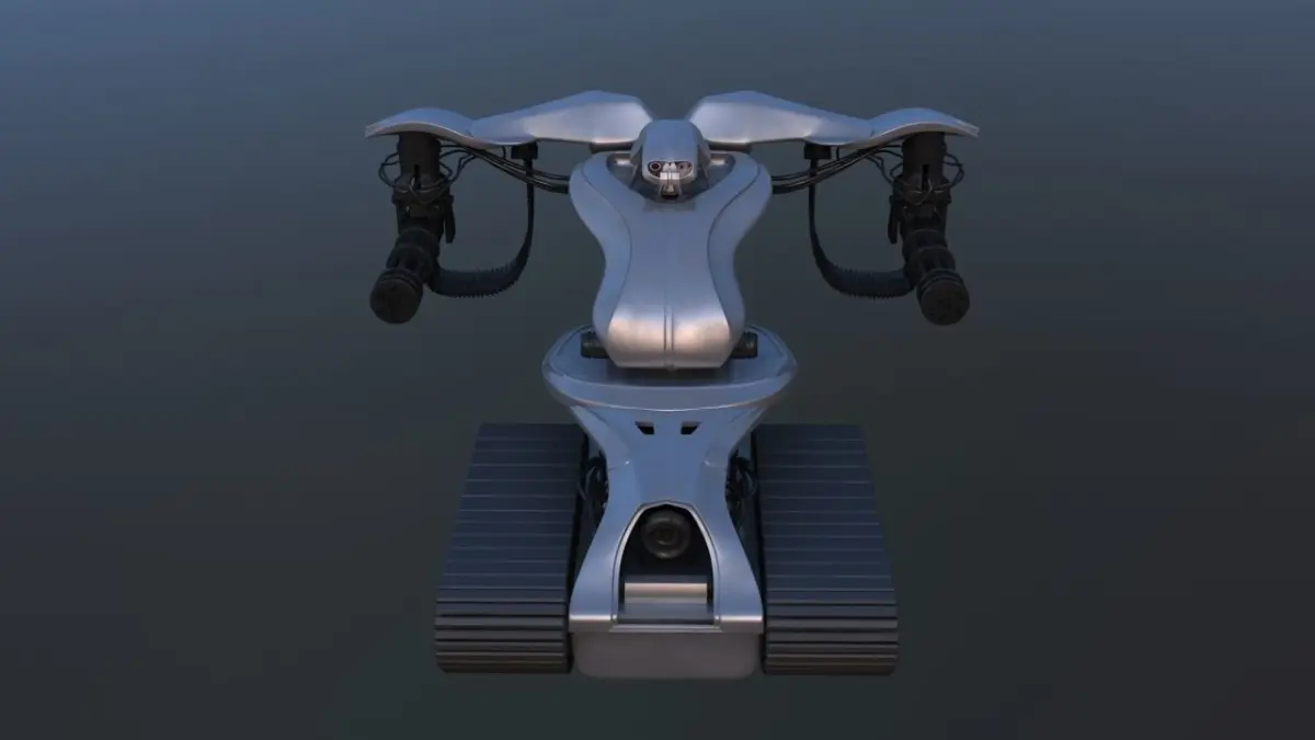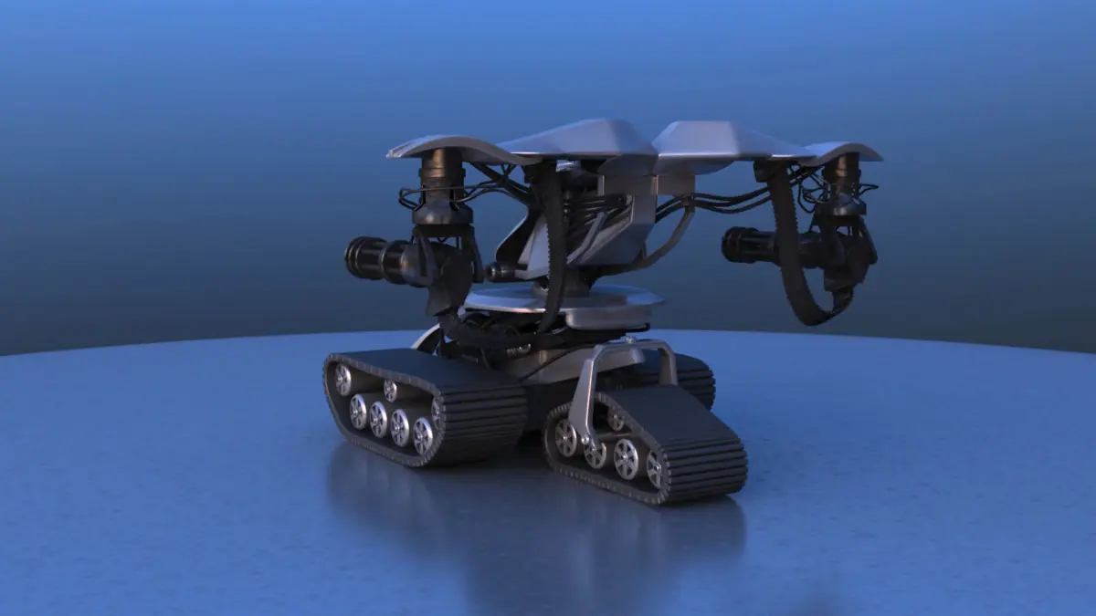 Terminator model from Terminator 3 Movie. The model does not have the exact design that was used in the film as it was designed by eye, but the concept and appearance are respected! The model has two Gatling guns, caterpillar drive, red eyes, bullet tape, some cables on the arms.