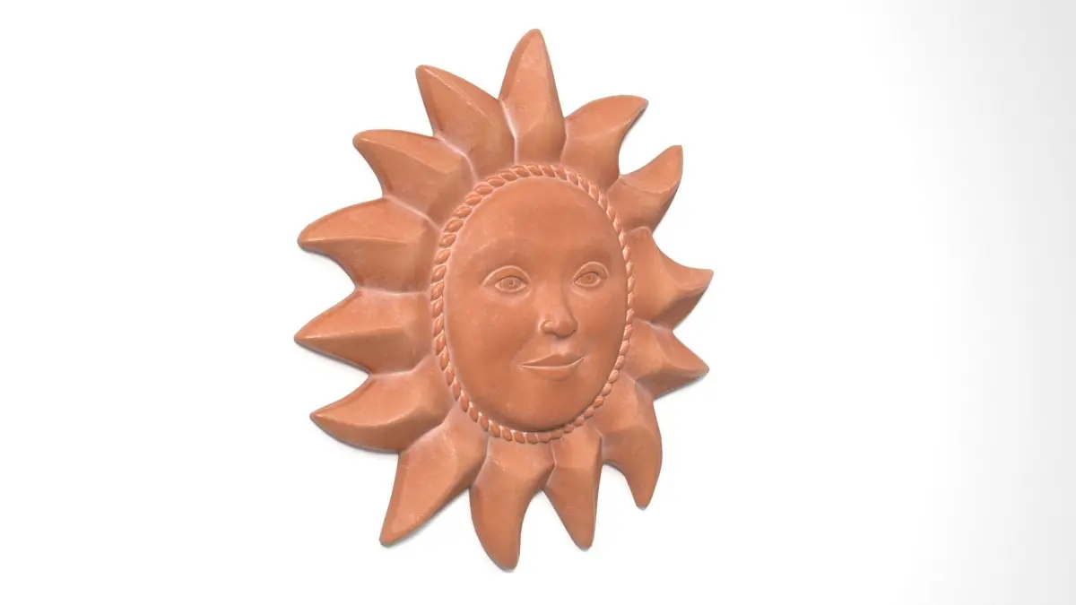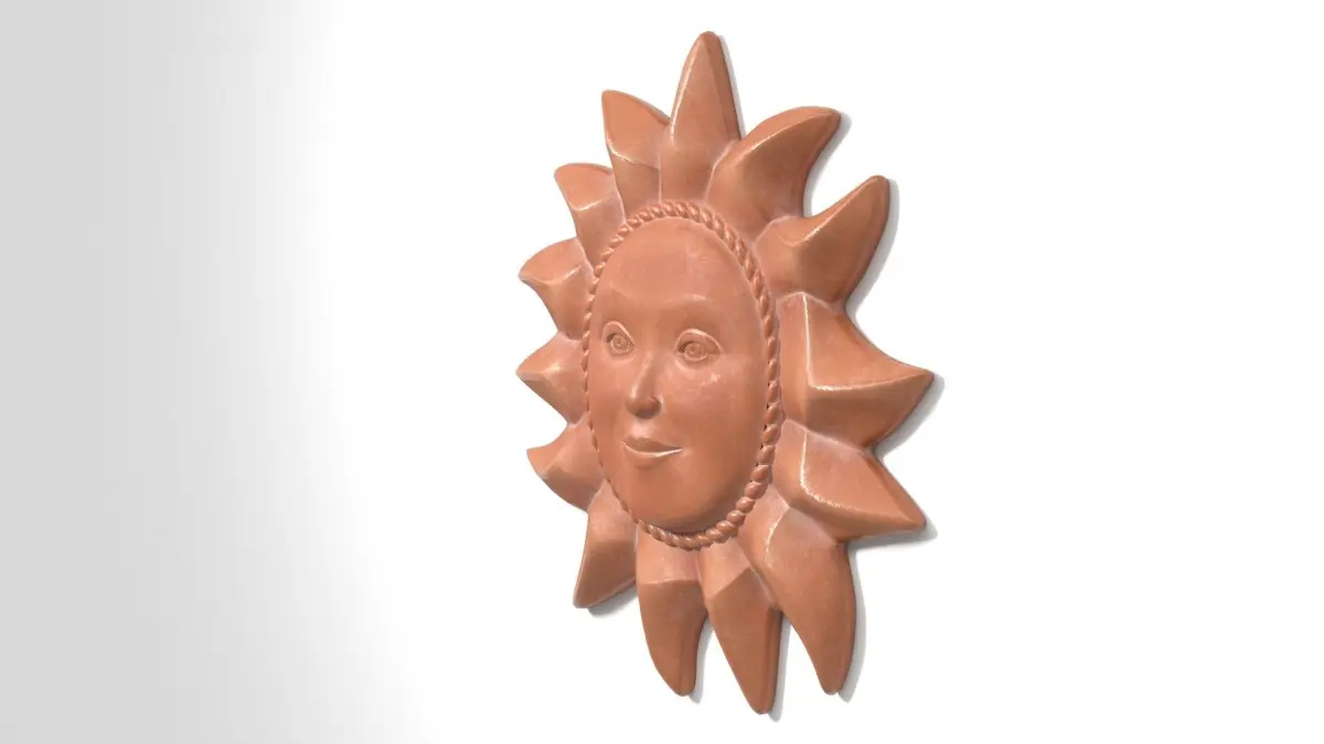 3D model of a terracotta sunface to decorate the walls in your renders. The product is in real world scale (set to centimeters), grouped, and positioned at World Center (0,0,0 coordinates). No N-Gons. All parts appropriately named, UV mapped, and textured.