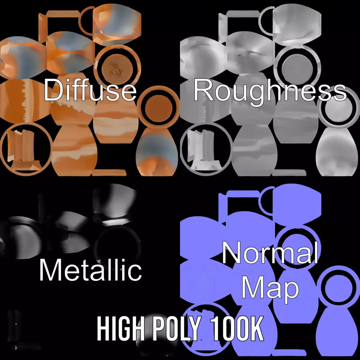 The Terracotta Vintage Vase model pack features a beautifully shaped vase with a natural, earthy texture perfect for interior decoration scenes, games, and architectural visualizations. Each model has 3 levels of detail: low-poly (1000 triangles for mobile), middle-poly (10,000 triangles for environment), and high-poly (100,000 triangles), which allows for the use of this model in production rendering (such as 3ds Max, Maya, Cinema4D, Blender, Vray/Corona/Cycles and all others), game engines (Unity and Unreal compatible), and interactive presentations, providing a choice of detail based on the LOD System principle. Perfect for use in home design simulators, historical recreations, or virtual staging. The model's textures are PBR, Diffuse, NormalMap, and reflection/roughness/metallic, which are suitable for any modern rendering engine. All models are accurately unwrapped with no overlapping UVs. All textures are 4096*4096 in size. Please like and leave a comment if you enjoyed this model!