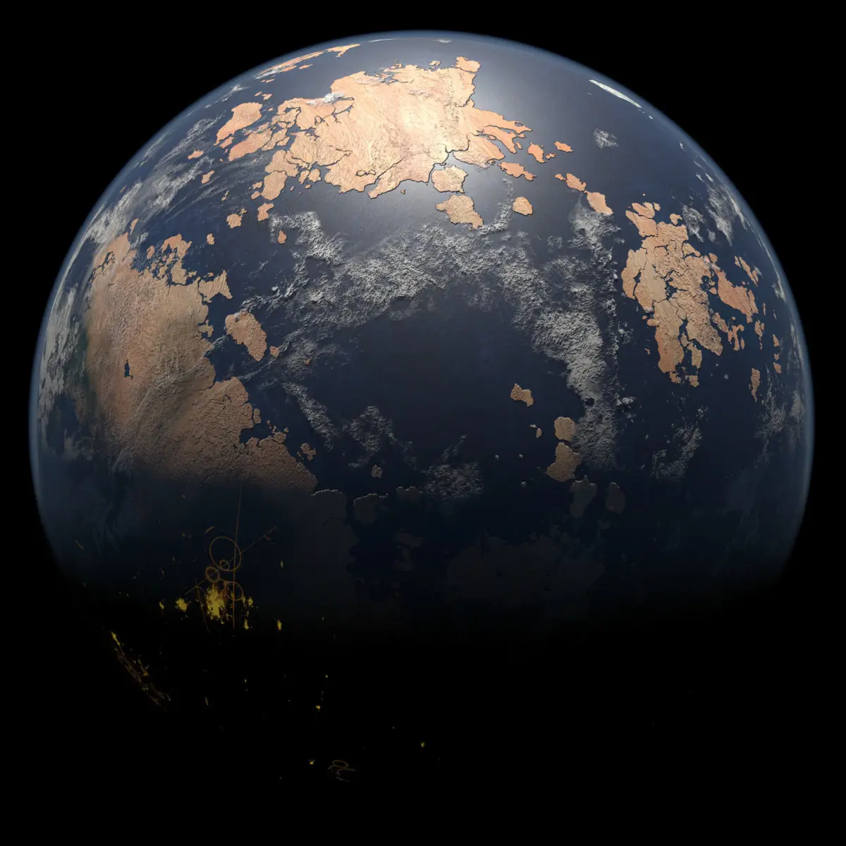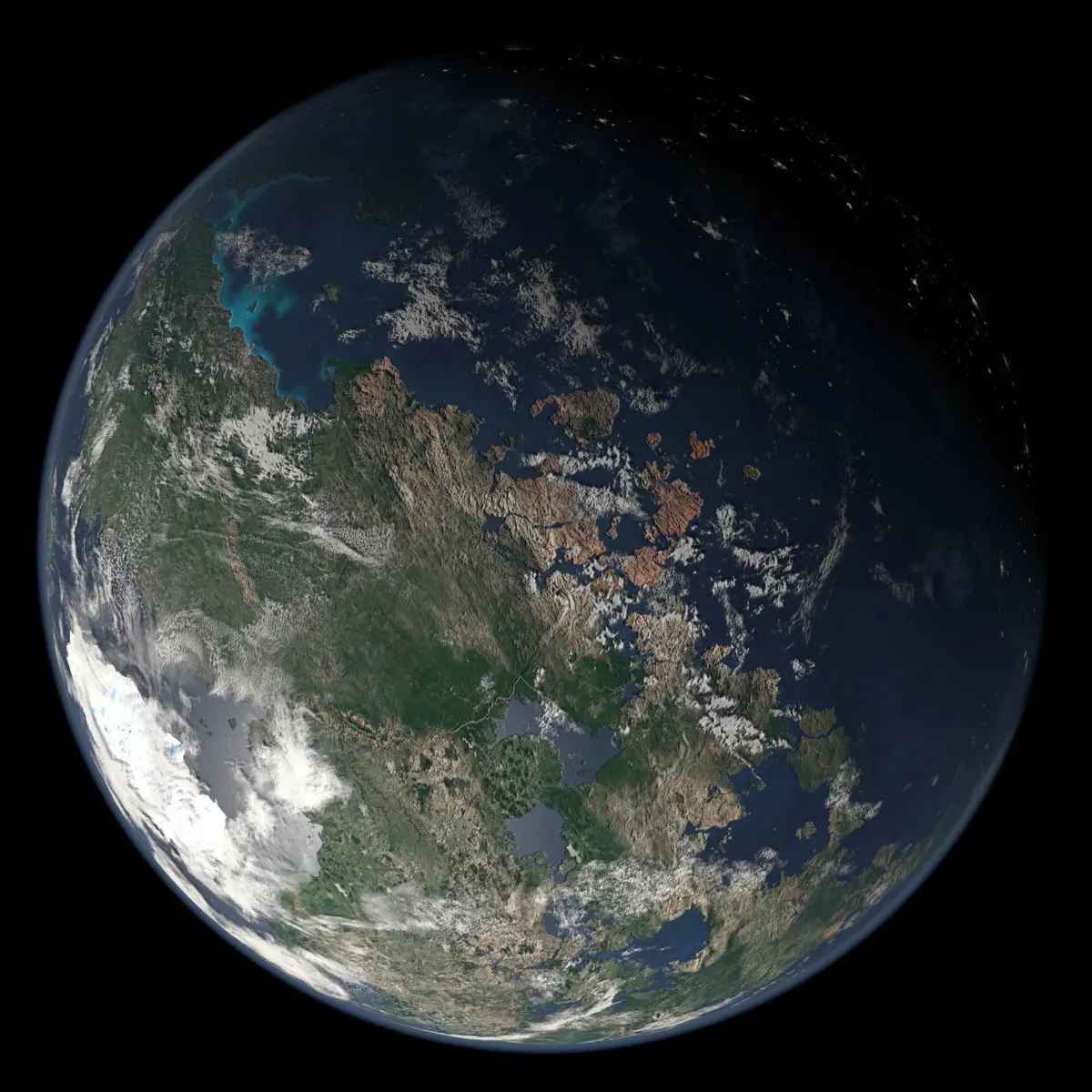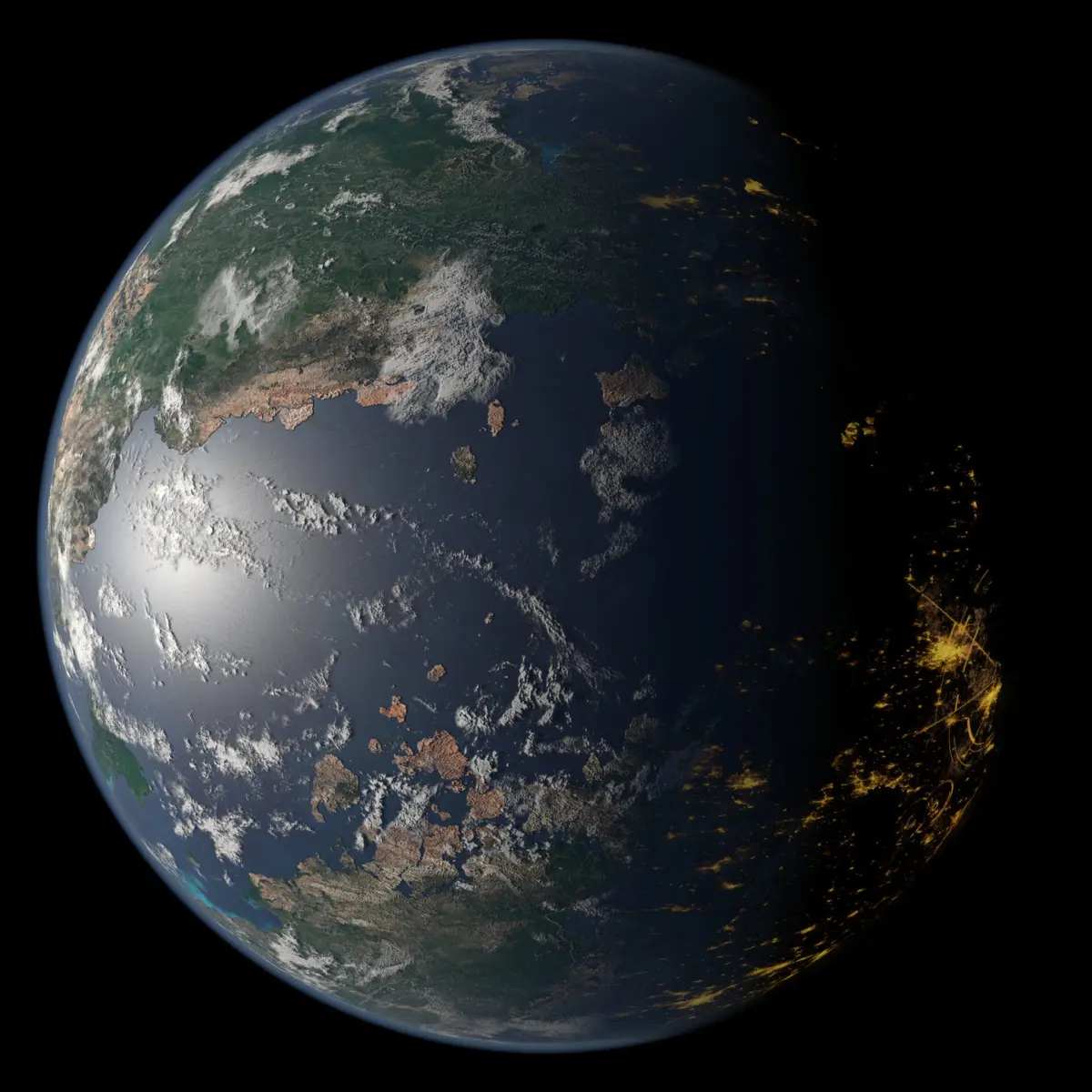 8,000 x 4,000 seamless, equirectangular planet texture of a generic terran-like planet. Includes dedicated diffuse, bump, specular, cloud, cloud bump, and light maps all generated using Blender and Gimp. Three different light maps were created to resemble different kinds of planet population: urban, rural, and metropolis. These can be used individually or combined for varied lighting effects.