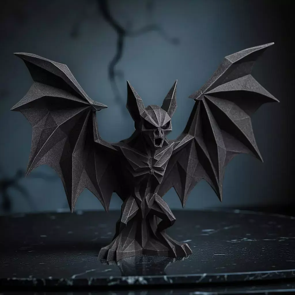 This 3D-printed Halloween bat combines origami-inspired folds with a skeletal body for a menacing look. With jagged wings, hollow eyes, and sharp, faceted details, it casts a dramatic silhouette. Built sturdy and stable for easy printing, this design is perfect for creating a chilling Halloween atmosphere.