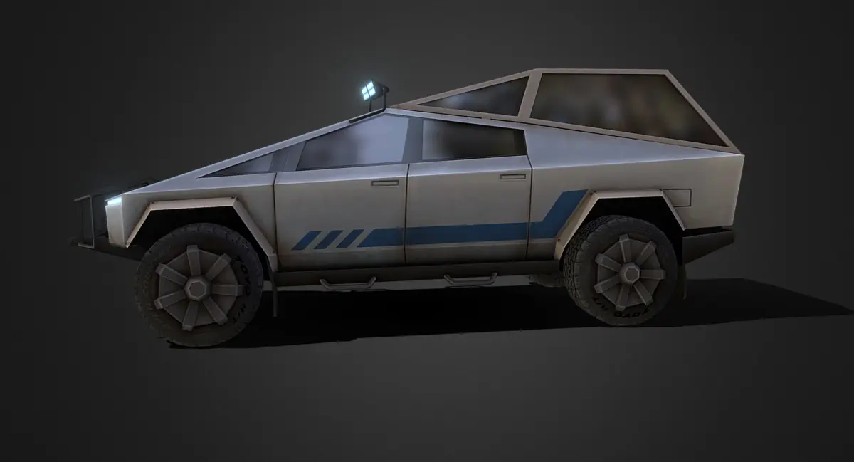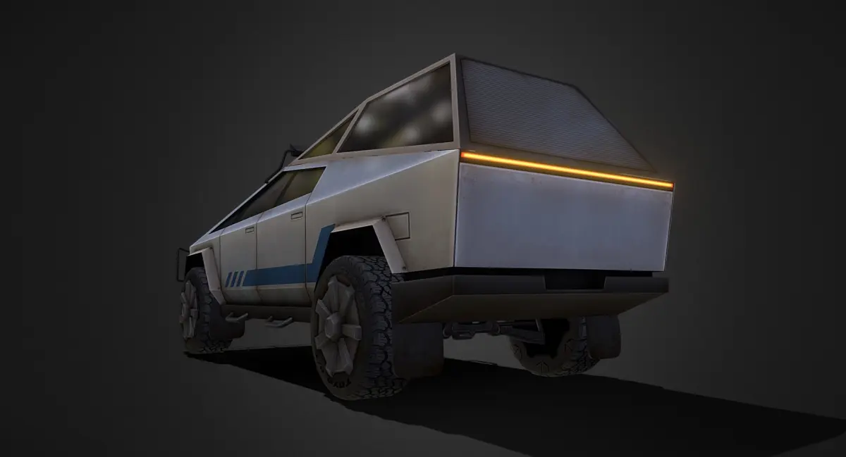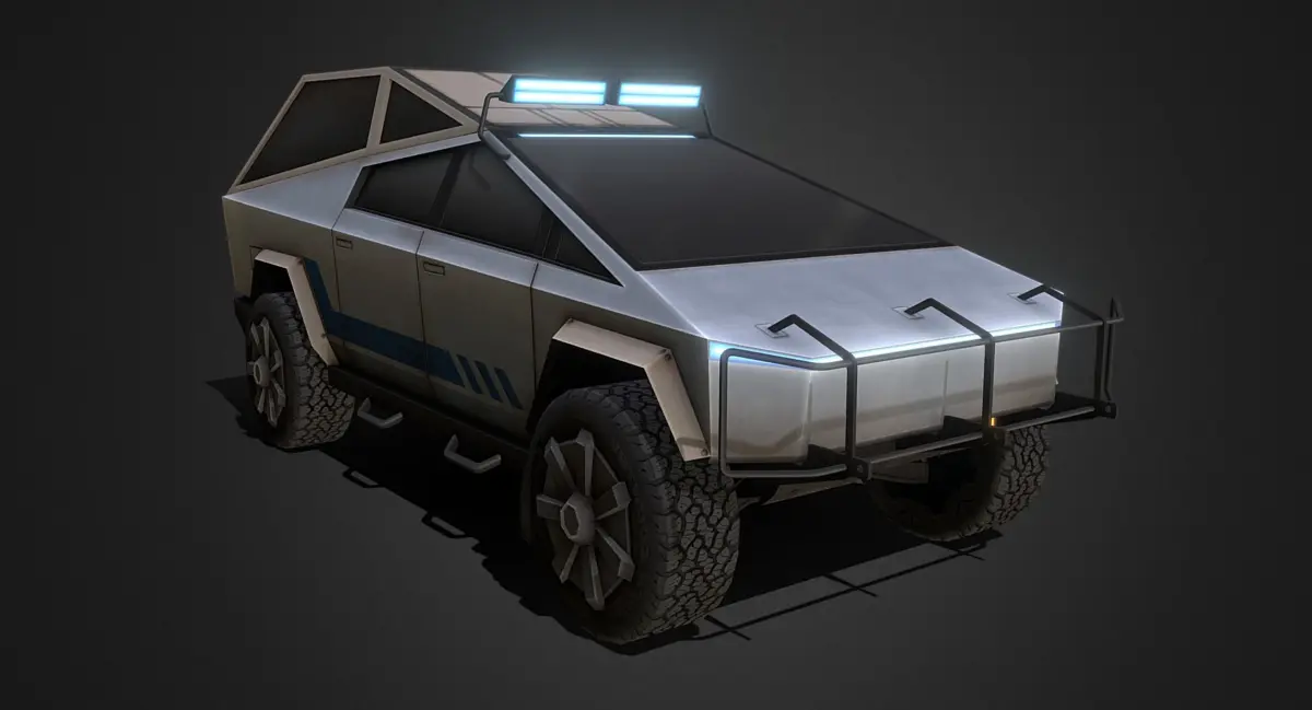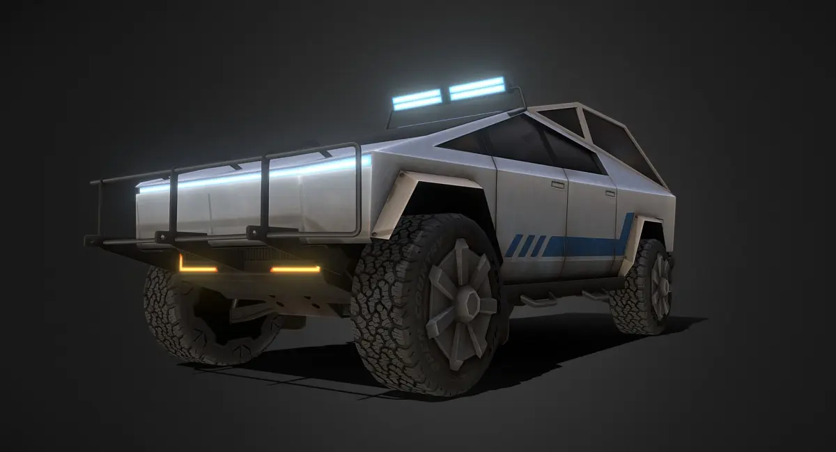 Tesla's Cybertruck reimagined as a burly sci-fi offroader. Modeled low poly for game engines. The first 5 presentation images show how the model appears in a game engine with basic three point lighting, the following images are how the model appears in 3ds Max with no lighting.