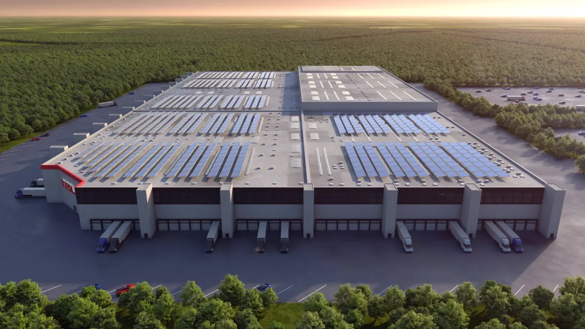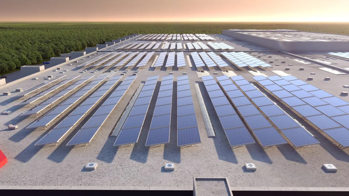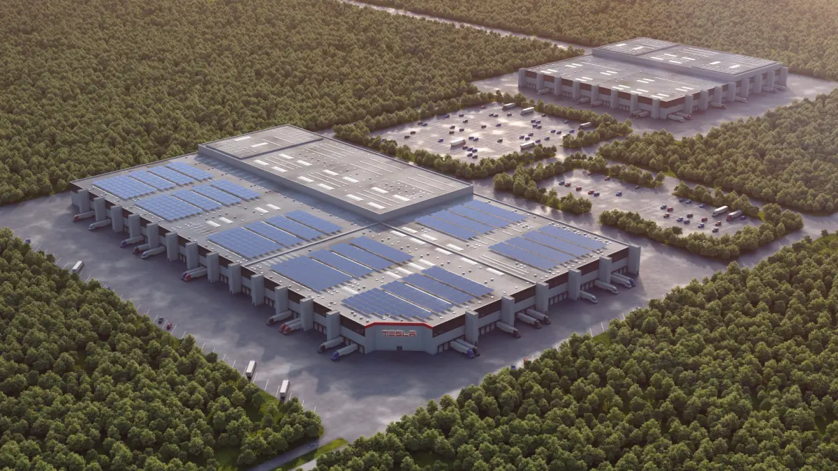 Ultra realistic 3d scene of Tesla Giga Factory in Berlin-Brandenburg, including factory building, surrounding area, roads, parking lots, trees and forest.