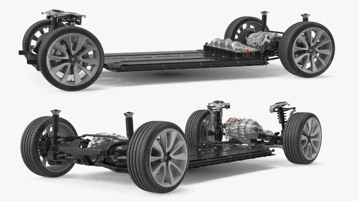 Tesla Model 3 EV Platform with Battery Pack is a three-dimensional model of Tesla Model 3 electric vehicle architecture, featuring an integrated lithium-ion battery system.