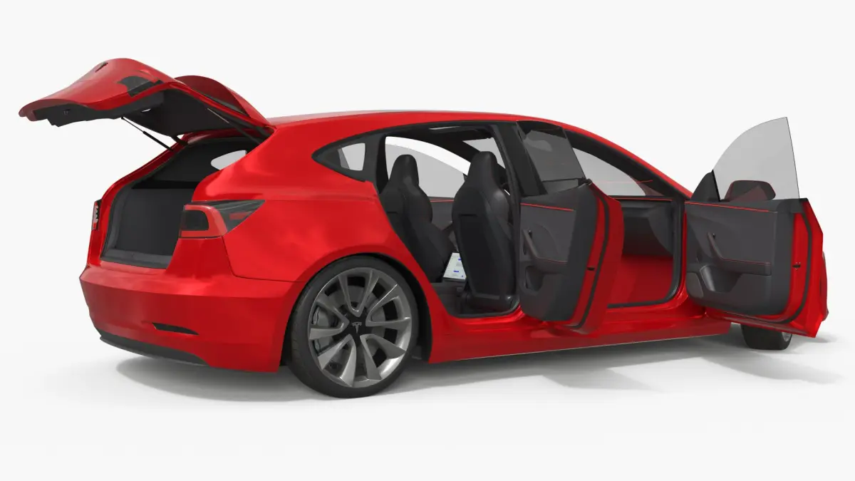 This model features a streamlined body, spacious interior, and cutting-edge elements like panoramic glass roof and aerodynamic lines. The open-back trunk and doors highlight its practicality and modern aesthetics, making it ideal for electric car designs.