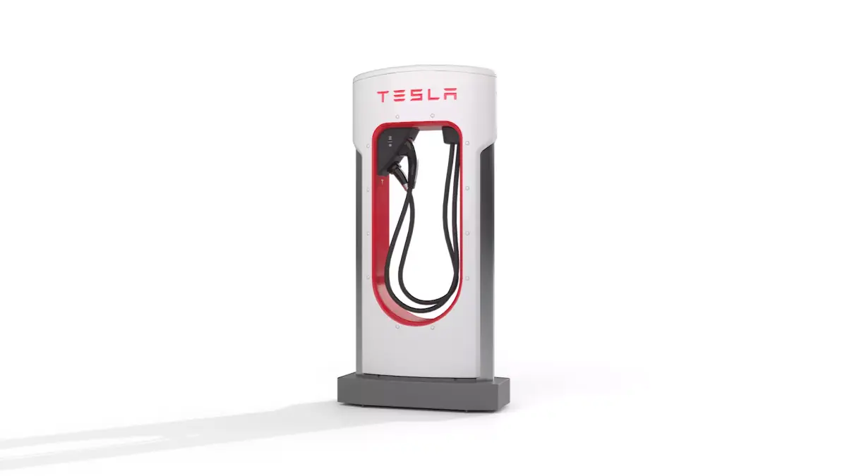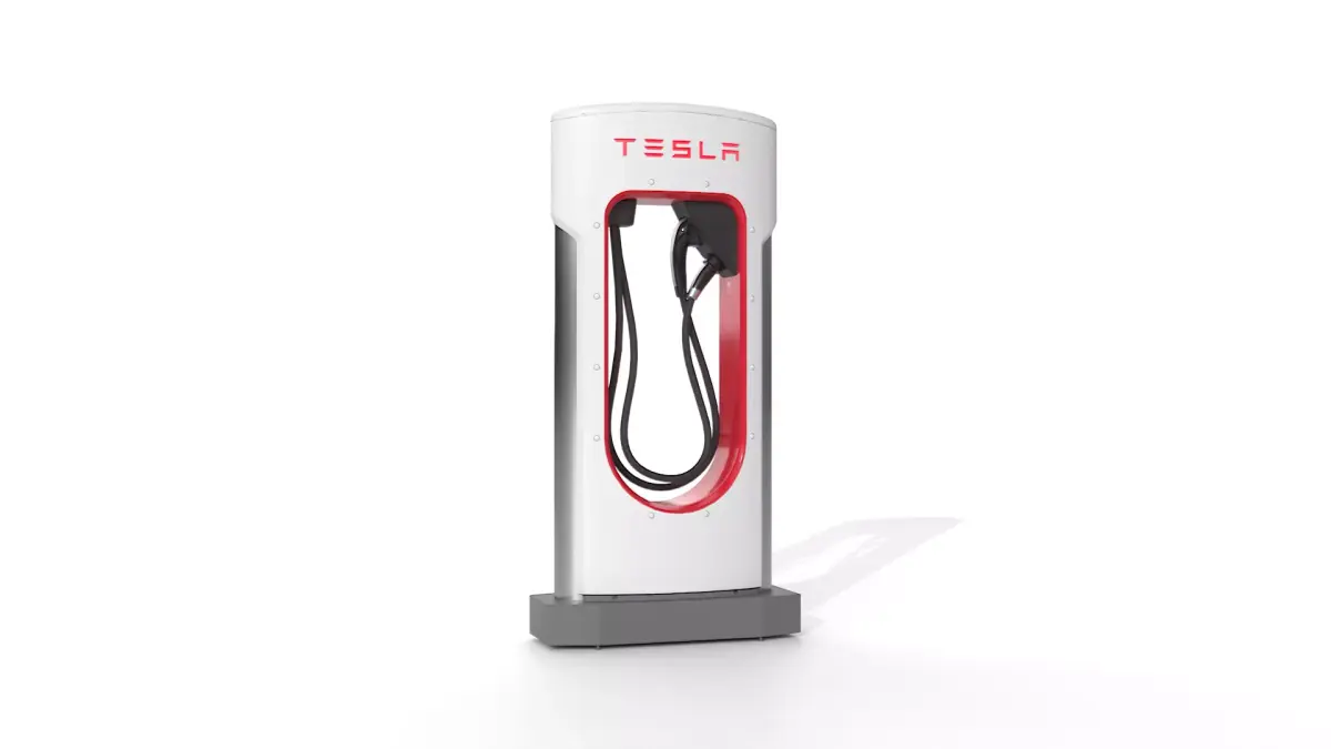 3D model of a Tesla Supercharger charging station with dual cables and connectors. Modeled in Plasticity, textured in Substance Painter and Blender. PBR textures, unwrapped UVs, triangulated geometry.