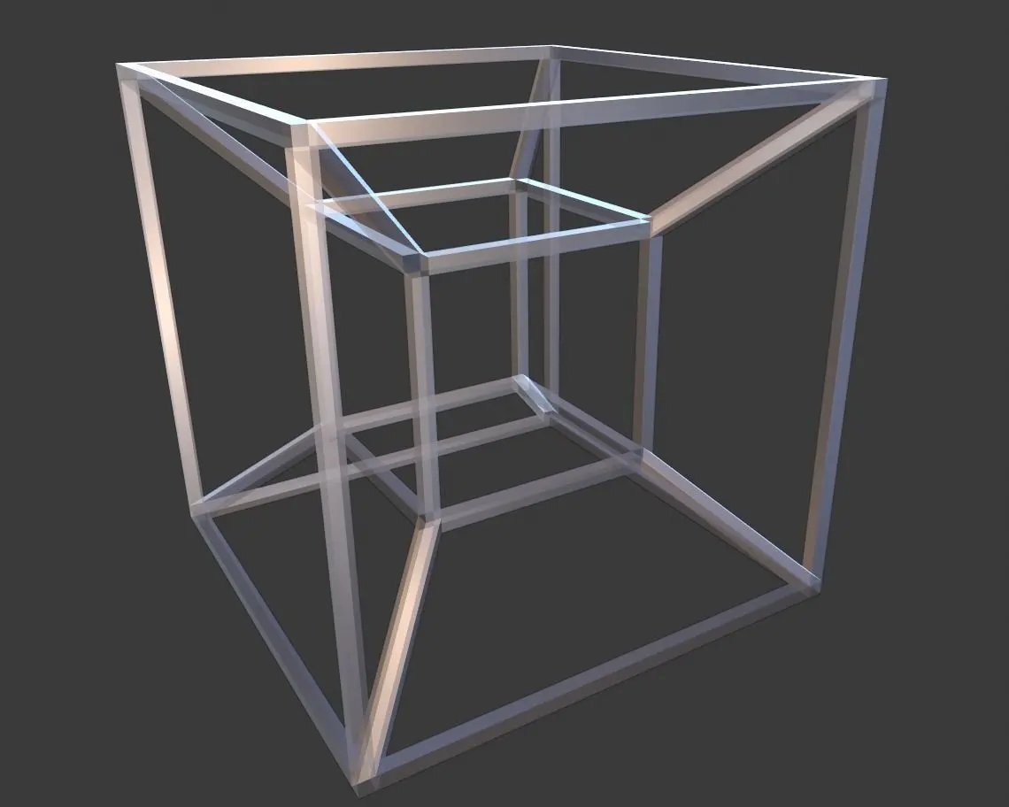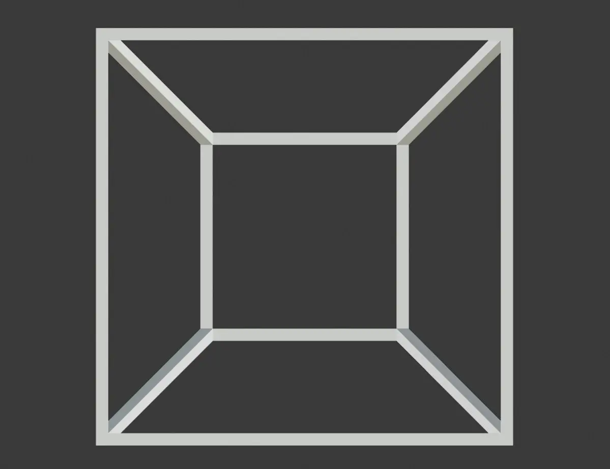 3D printed model of tesseract (hypercube). This model is example of mathematical abstract art and can be used for any abstract art, printed one can be used for interior design, jewellery and so on. Model has manifold solid topology, each diagonal has 6 faces. You can use SLS, SLA and other technologies to print it.Moreover different textures and materials can be added and tesseract can be set in any scene.Dimensions: X: 4m Y: 4m Z: 4m