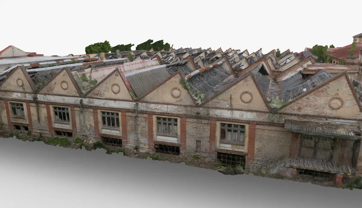 Historic old classic classical german19th 20th century ruined derelict abandoned textile manufacturing industrial factory building brickwork cracked concrete facade scene with broken wooden roof 3D model