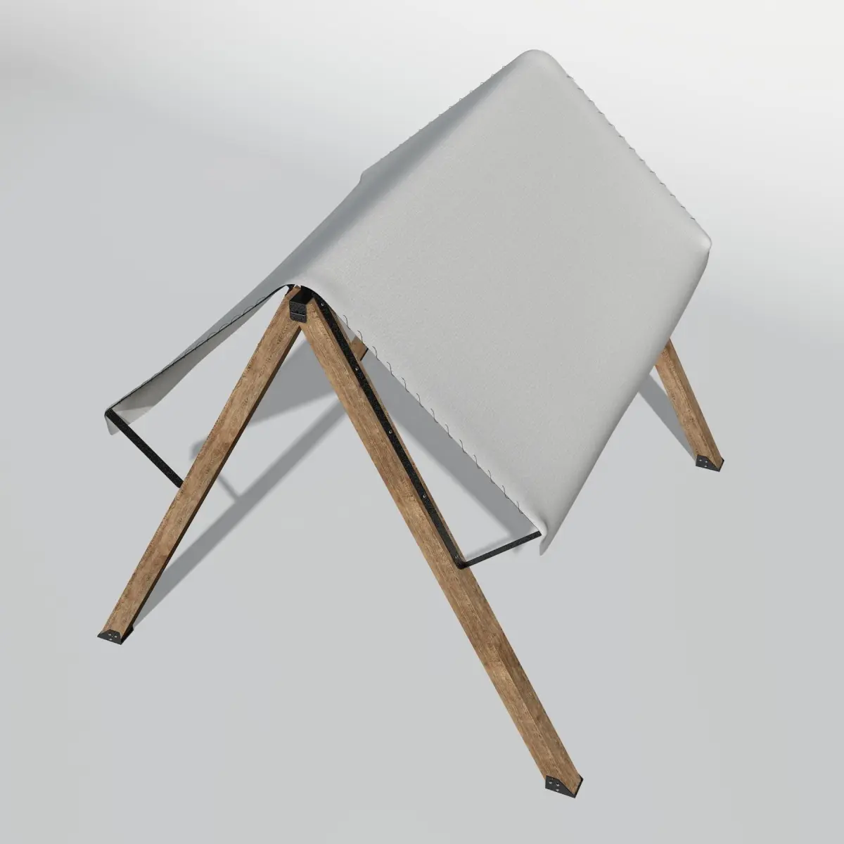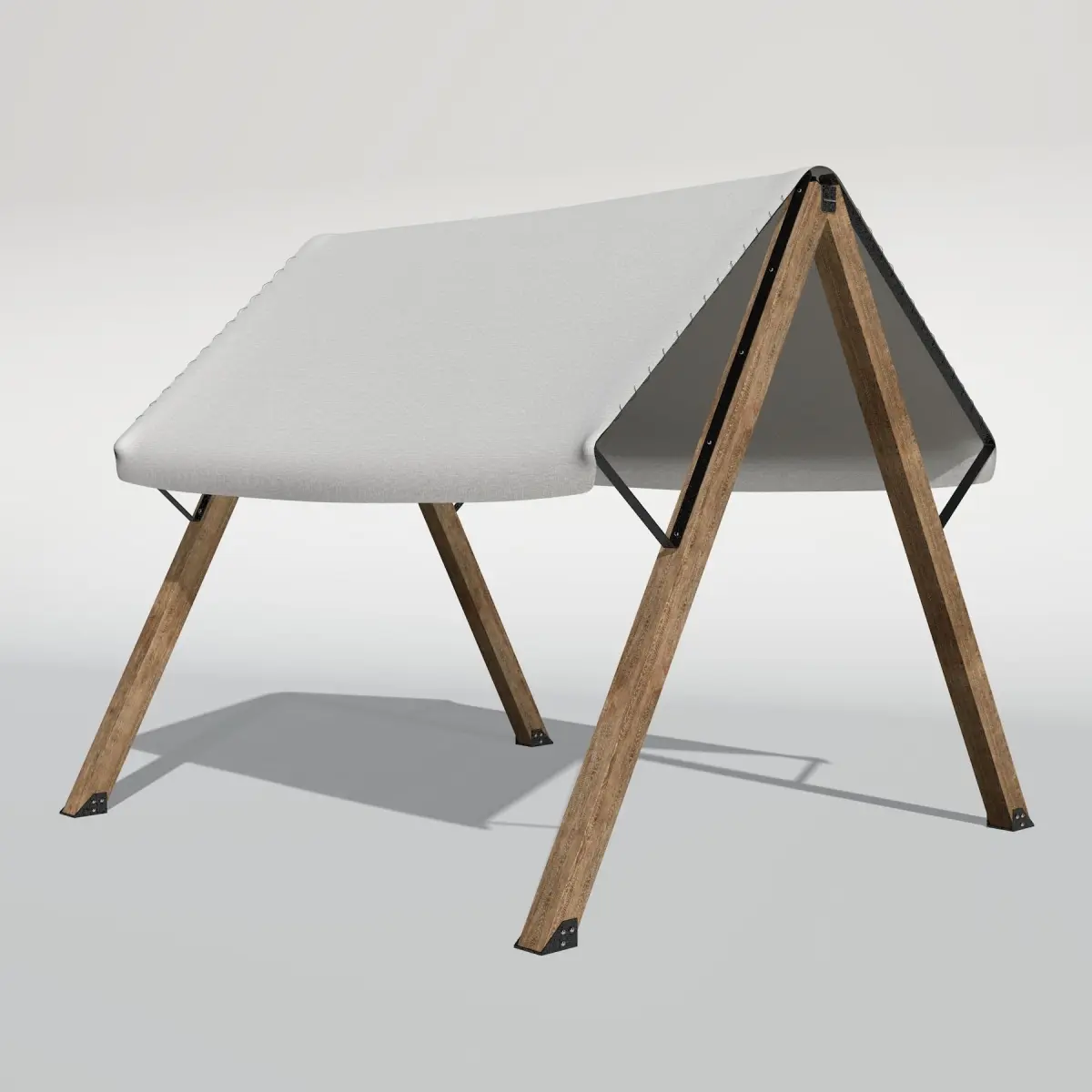 Textile patio sunshade on two wooden supports.Objects in scene 31. Metal materials are created from standard presets.