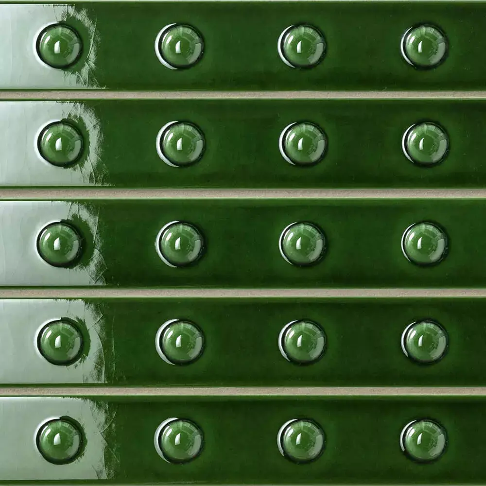 High-quality ceramic wall tile surface in glossy green, with repeated raised dot motifs for a dynamic 3D effect.