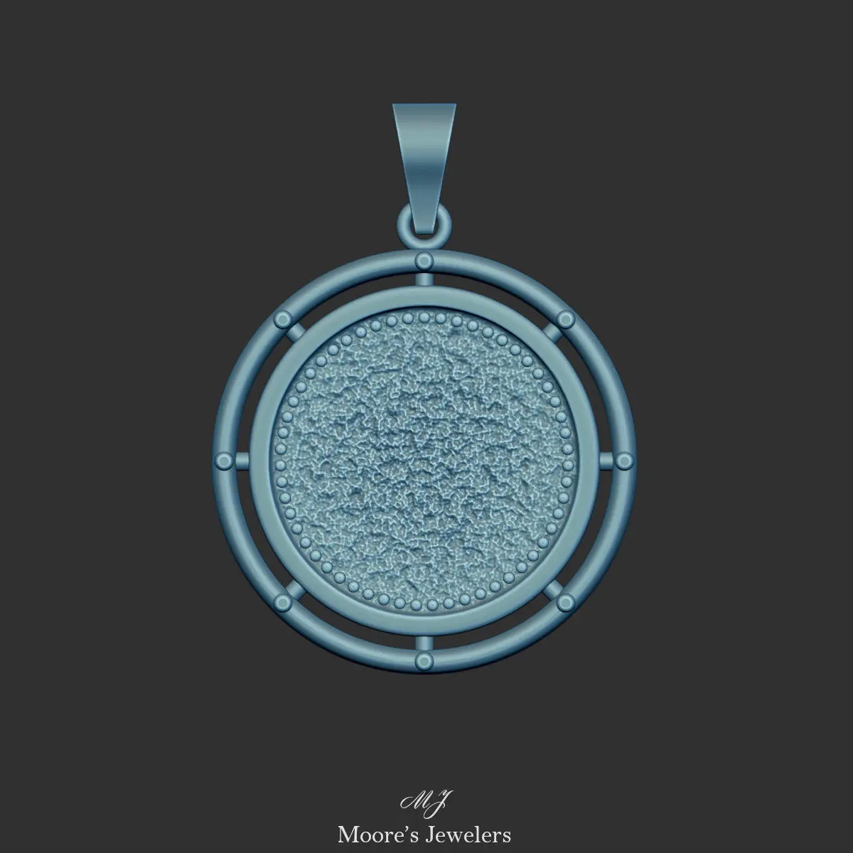 From the inner ring connecting to the outer ring are 8 posts with 8 accents raised up .5mm on the outer ring. These elements are visual interests and help keep the viewers gaze within the pendant.