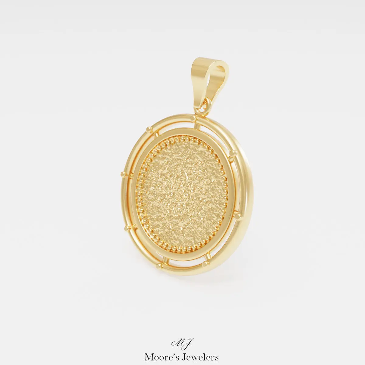 The medallion style pendant has a nugget textured pattern in the center. Easily can be left blank or any symbol or initials can be added to personalize the piece.