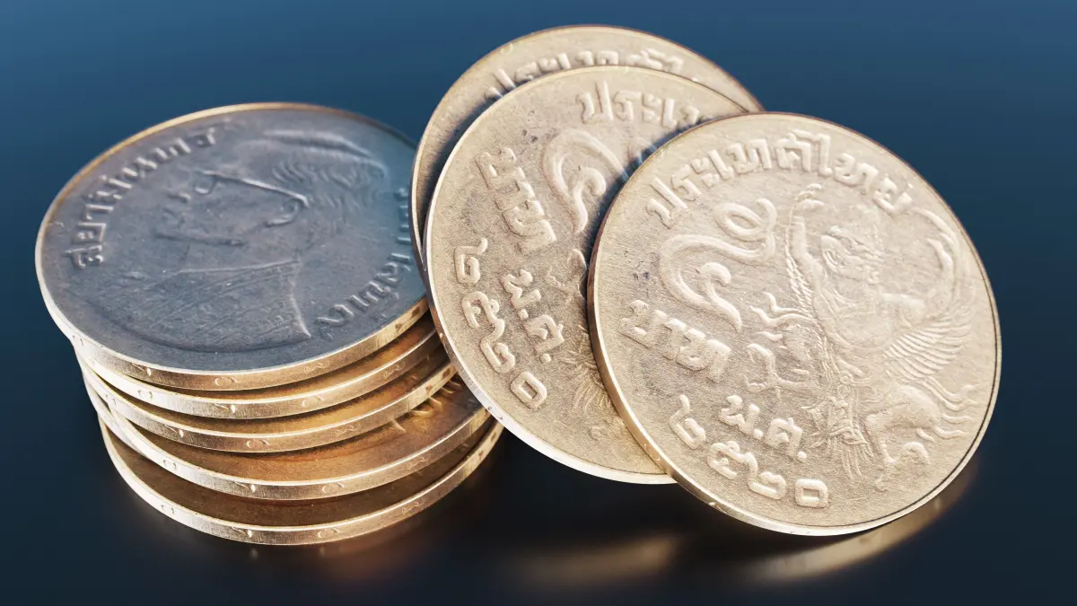 Historical description of the coin: This is a Thai 5 baht coin from 1980 (2523 in the Thai Buddhist Era calendar).The obverse (left side) features the Garuda, which is Thailand's national emblem - a mythical bird-like creature. The Thai text indicates the country name ประเทศไทย (Thailand) and the denomination ๕ บาท (5 baht), along with the date พ.ศ. ๒๕๒๓ (Buddhist Era 2523, equivalent to 1980 CE).The reverse (right side) displays a profile portrait of King Rama IX (Bhumibol Adulyadej) wearing glasses. The Thai inscription around the edge shows his official title.The coin appears to be made of a copper-nickel alloy, giving it its bronze-like appearance. The 5 baht was a common circulation coin in Thailand during this period. King Rama IX was Thailand's longest-reigning monarch, having served from 1946 until his death in 2016.