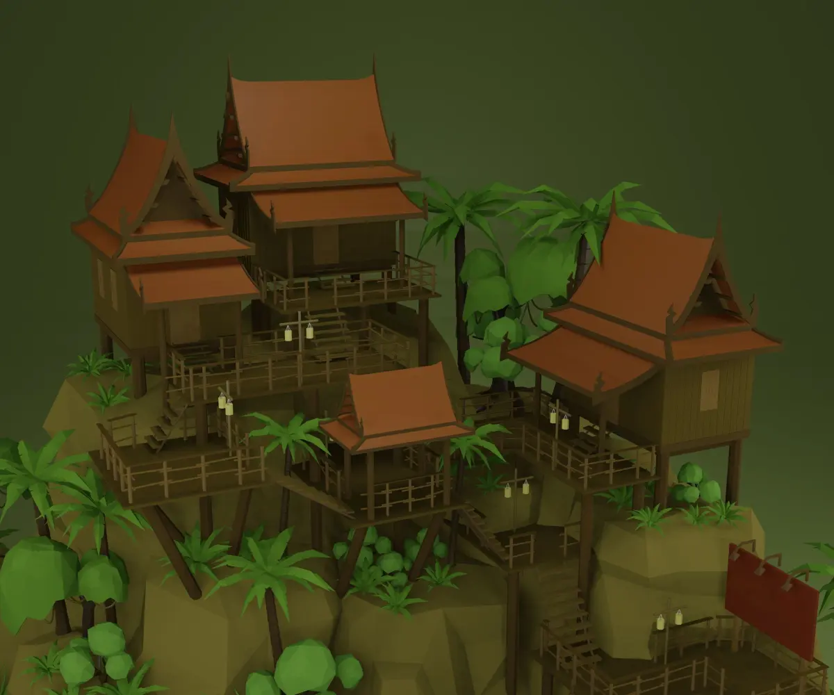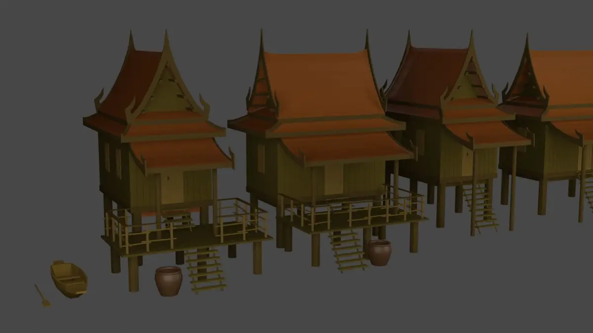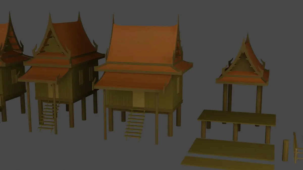 Model Thai houses and wooden corridors, suitable for making games. or designing various 3D works. (Materials may not work in programs other than Blend.)