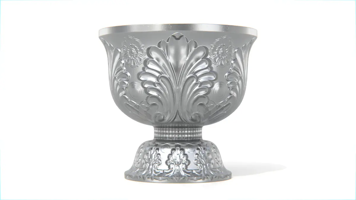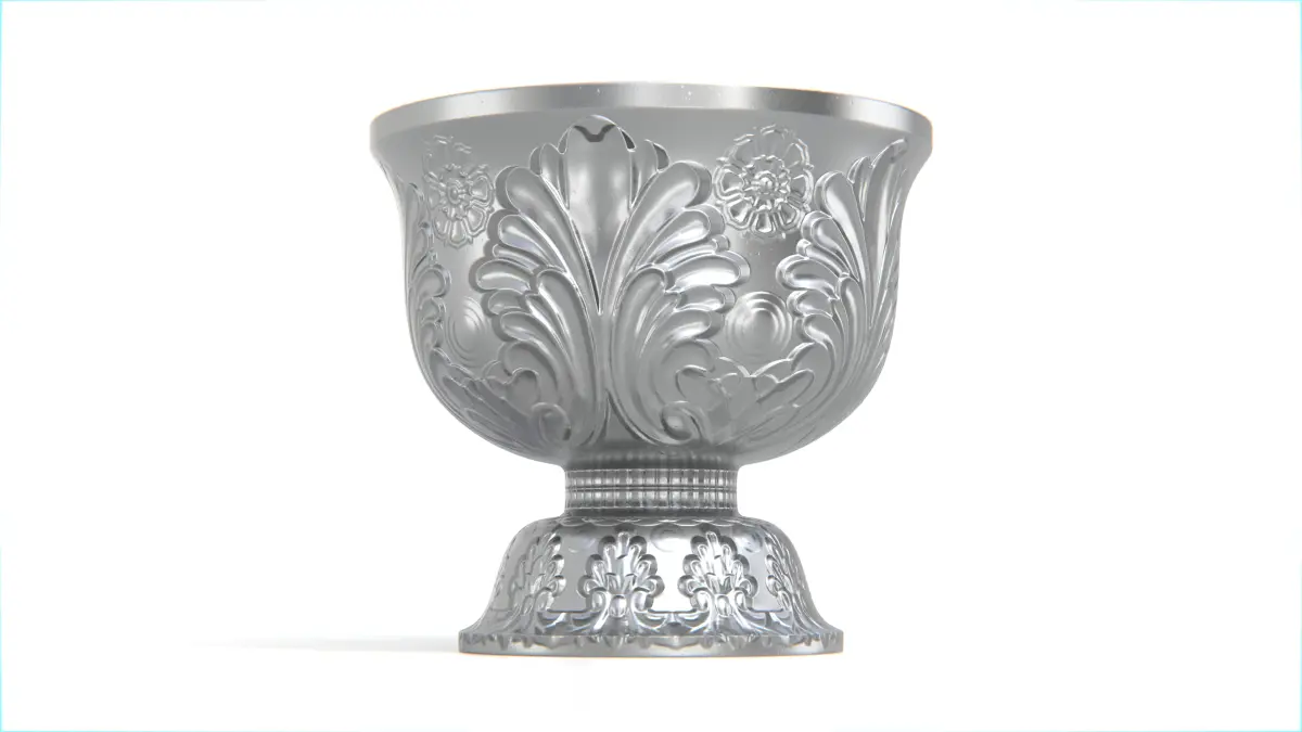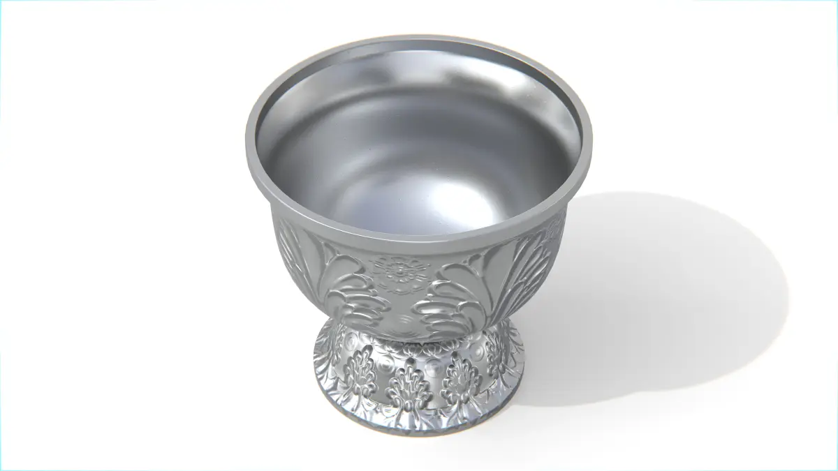 This traditional Thai pedestal bowl features a round, elevated base and finely embossed floral and leaf patterns across the exterior surface. The design is symmetrical and ornamental, rendered in a metallic silver tone for a ceremonial and cultural appearance.