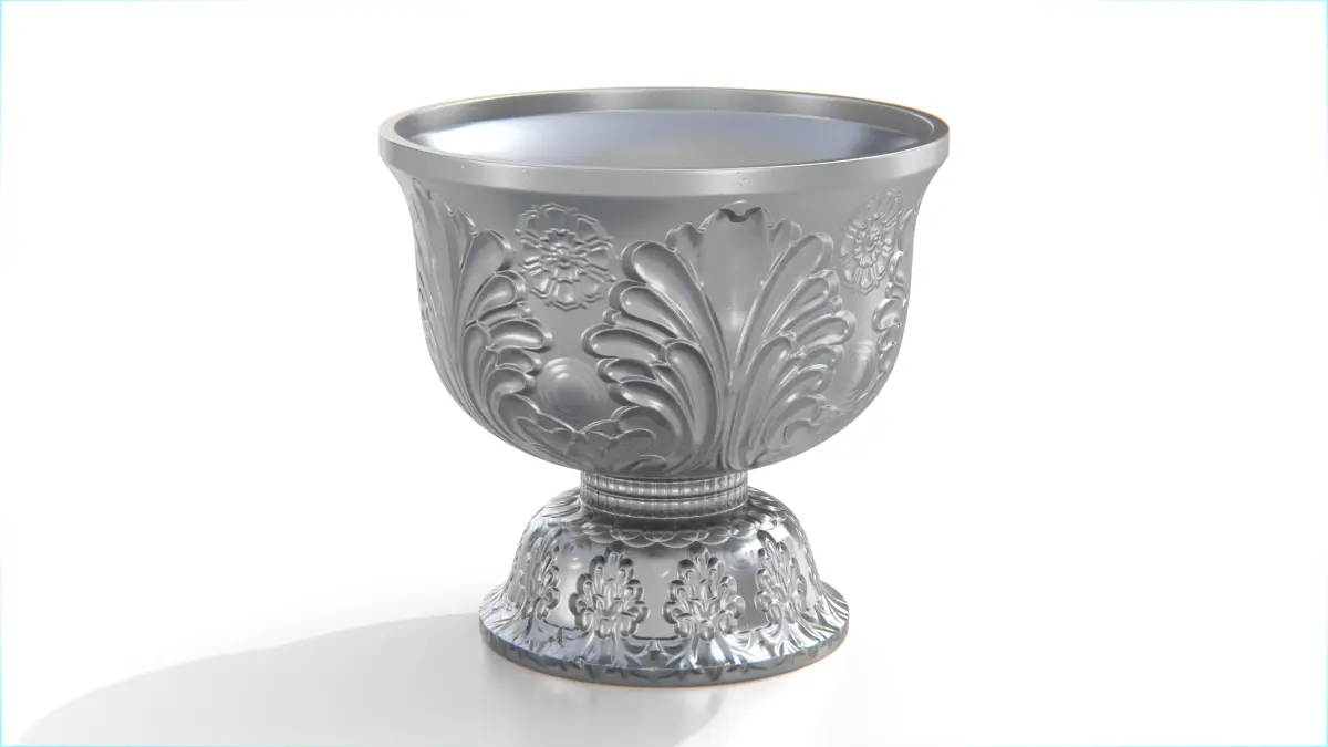 The bowl's structure is modeled cleanly with smooth interior curvature and sharp decorative relief, making it ideal for both close-up shots and distant placement in scenes. Its elegant form and symbolic patterns evoke Southeast Asian craftsmanship and heritage.