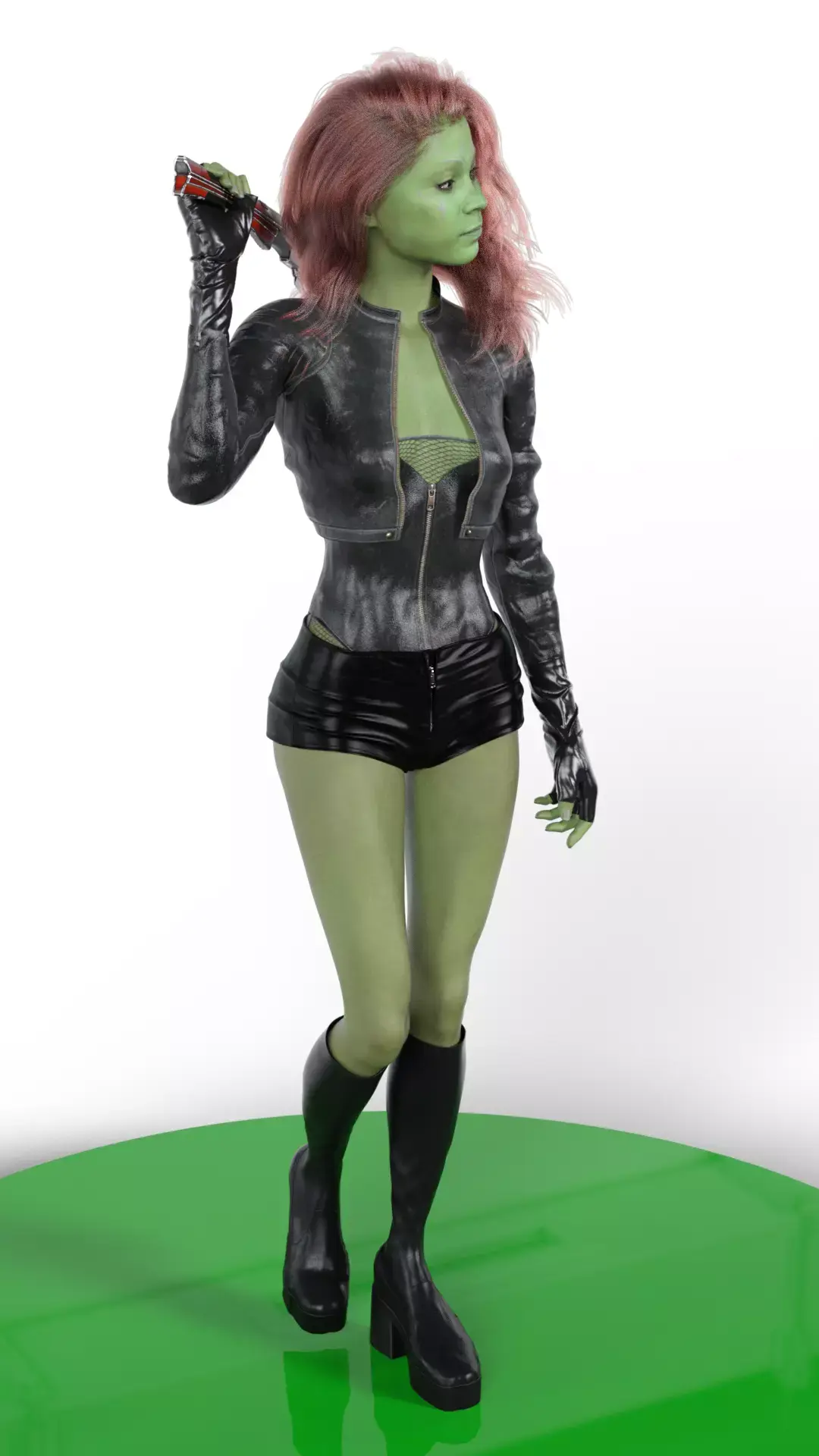 A high-resolution, photorealistic 3D render featuring Gamora, the Zen-Whoberi Assassin, in a bold, biker-inspired style. Her characteristic emerald green skin and wind-swept reddish-pink hair contrast sharply with her outfit. She wears a distressed black leather cropped jacket over a mesh or net top, paired with shiny high-cut leather shorts. The look is completed with long, fingerless gloves and black knee-high platform boots, giving her an imposing stature. She holds a futuristic, segmented katana over her shoulders, projecting an attitude of lethal confidence. The figure stands on a bright, reflective circular green base, dramatically highlighted against the pure black background.