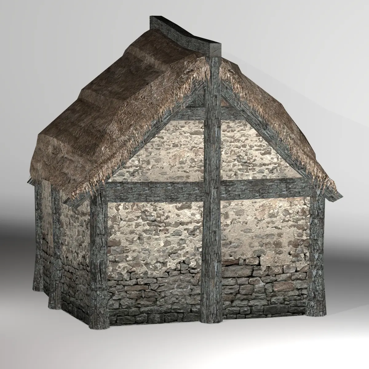 Small lowpoly Thatched house with four texture variations for the walls, two texture variations of the timber frame, and two texture variations(in one file) for the doors. It has 838 vertices,597 faces, and 1176 triangles. It was not modeled to be entered. (If You need it with inside modeled - please contact me) The native format is Blender. Scale in the native app - approx 4.9x6x6.3 m (16x19.7x20.6 feet). Origin is at the world center and at the bottom center of the building. Models positioned on layers in Blender and exported as an archive of 4 separate meshes in other included formats. Beauty renders are with Blender internal, other previews are within app (Blender) views. Preview with the wood piles is a sample, wood is not included (Sold separately as my product). The last preview is a sample screenshot from Unreal Engine where double-sided materials with translucency were used on the thatch.UE Mannequin and scene are for scale and not included.