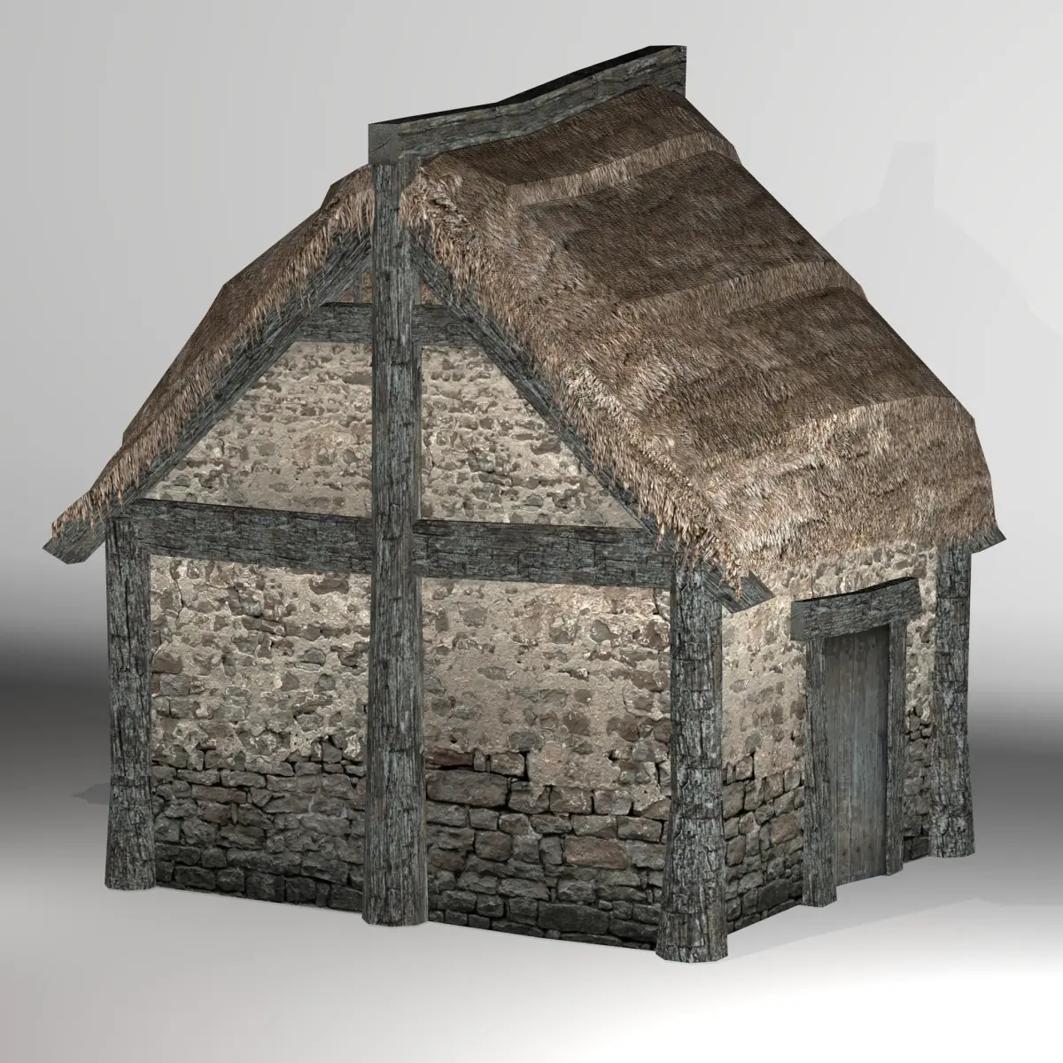 Textures include: 2048x2048 JPG format - Dark weathered wood, Light weathered wood(does not have separate Normal, Specularity and Displacement since it can use the ones from the Dark wood texture), Dirty planks, Thatch (upper part), Plaster, Brown Daub, Plaster with stone, Two doors Diffuse and Normal maps are used in the native file (Blender). Specularity and Displacement are included for convenience in the texture pack, but not used. 1024x512 PNG with transparency + Normalmap used (in Blender) - Bottom part of the thatch (Specularity and Displacement are included for convenience in the texture pack, but not used.)