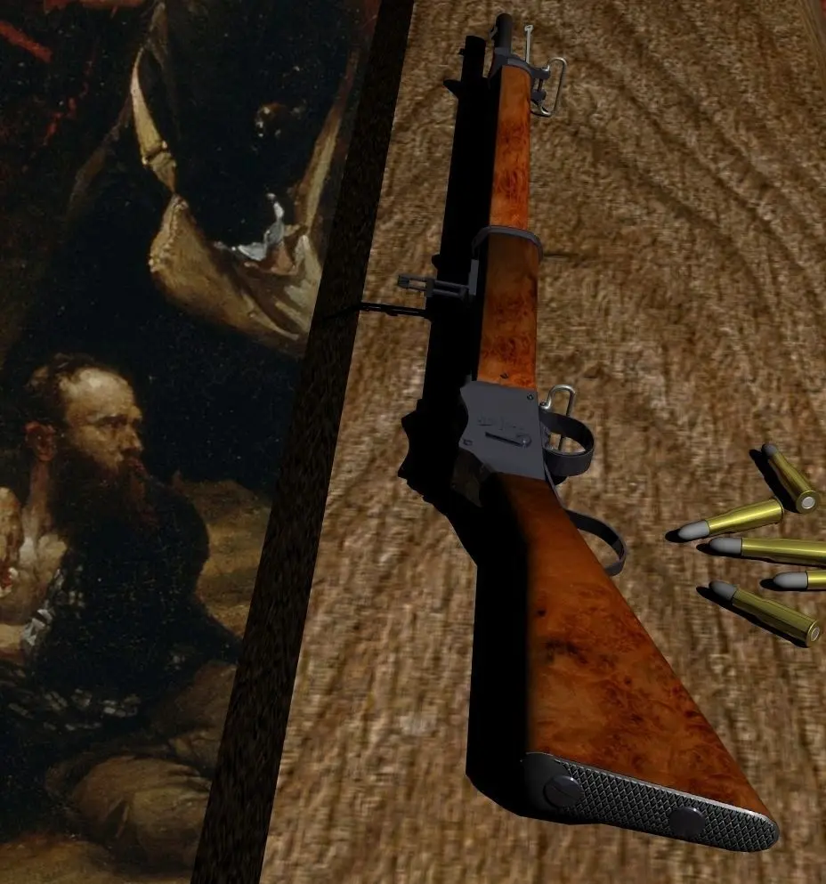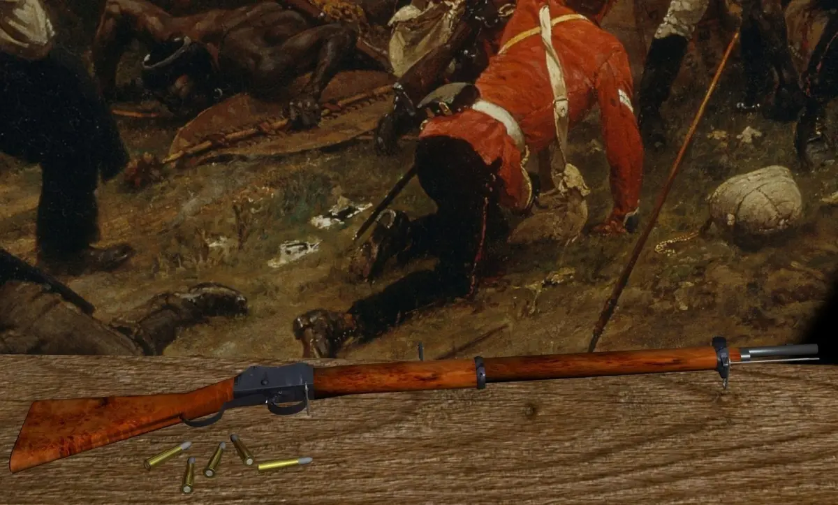 The Martini–Henry is a breech-loading single-shot lever-actuated rifle that was used by the British Army for thrity years. It was the rifle that was used at the defence of Rorke's Drift in South Africa in 1879. It also saw service in India, Pakistan, Afghanistan and elsewhere in the British Empire. Many are still in use. In the 21st Century, United States Marines recovered at least three from various Taliban weapons caches.Designed in 1870 this powerful rifle was made by various manufacturers from 1871 to 1889. About 500000 to 1000000 were produced. The uncertained over the numbers stems from the fact that many excellent copies were made, especially in India and neighbouring countries.Its 0.452-inch lead bullet (model included) was round-nosed with a tapered head with a total length of about 80mm. The soft hollow-based lead bullet was wrapped in a paper patch giving a wider diameter of .460 to .469-inch. The cartridge case was ejected to the rear when the lever was operated.Later variants used 0.303 inch bullets and the 0.45 bullets are no longer manufactured. A good rifleman can maintain a rate of fire of 12 to 14 rounds per minute.The rifle was 1245mm long, the steel barrel 840mm. Rifling produced a heptagonal barrel with seven grooves with one turn in 560mm.The weapon weighed 3.83 kg. The standard bayonet (not included) was a socket-type spike, Pattern 1876 overall length 635mm, referred to as the lunger.