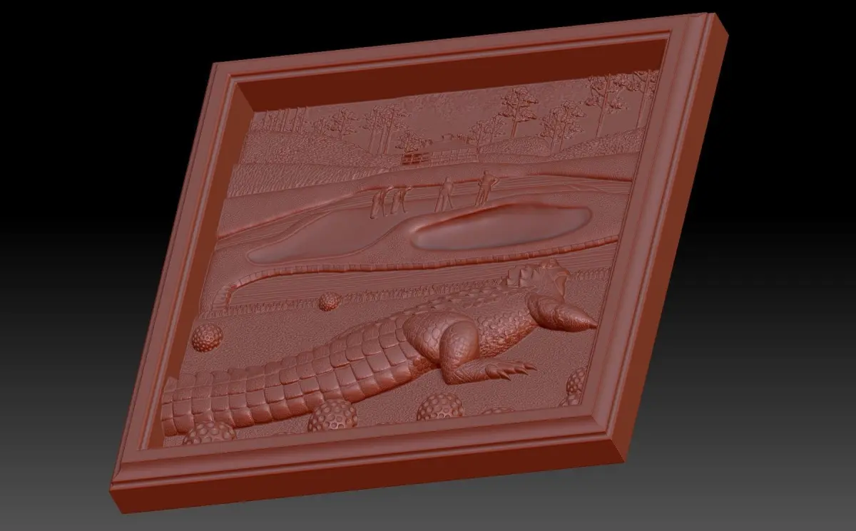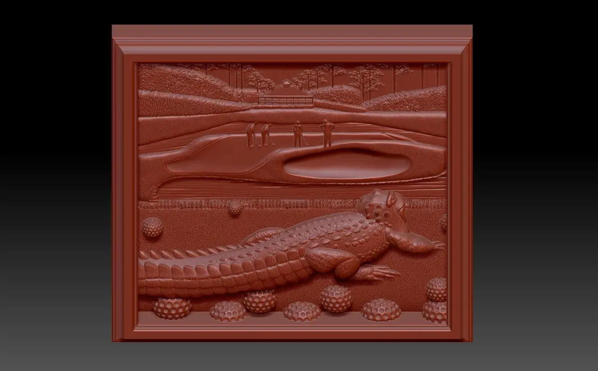 A bas-relief painting with an alligator. The work depicts a plot where a reptile is on a golf course and looks at a group of people playing golf. The alligator has its back to us, which makes the person looking at the composition a participant in this plot.