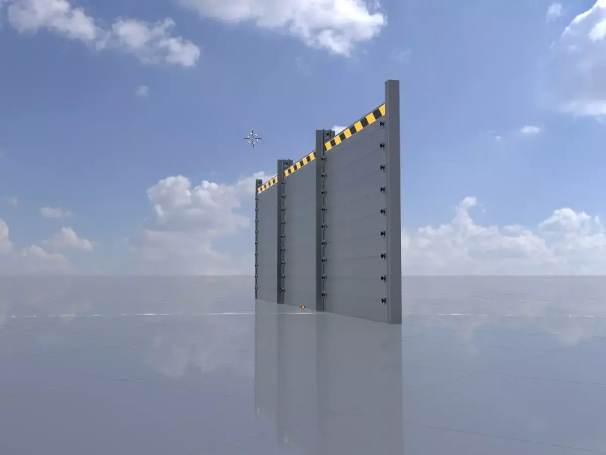 - Hier sehen Sie ein 3D-Modell einer aus Aluminium bestehenden Hochwasserschutzwand.