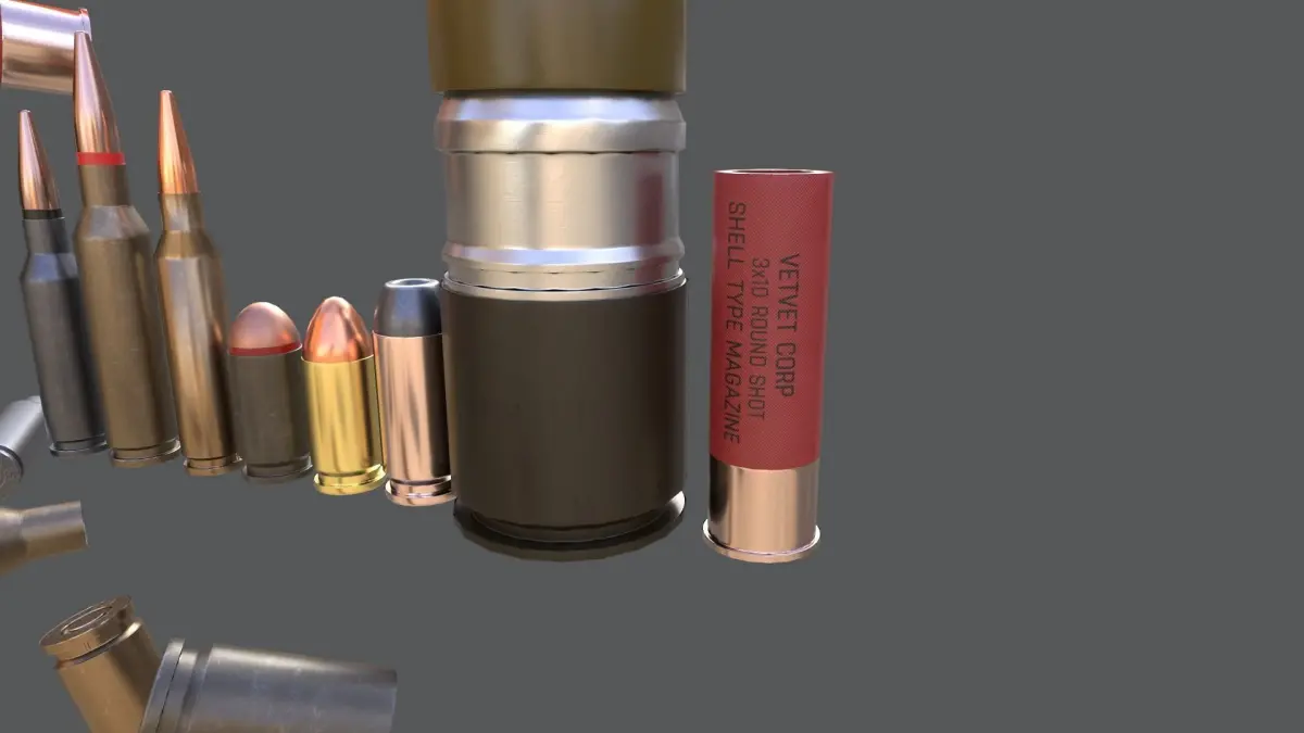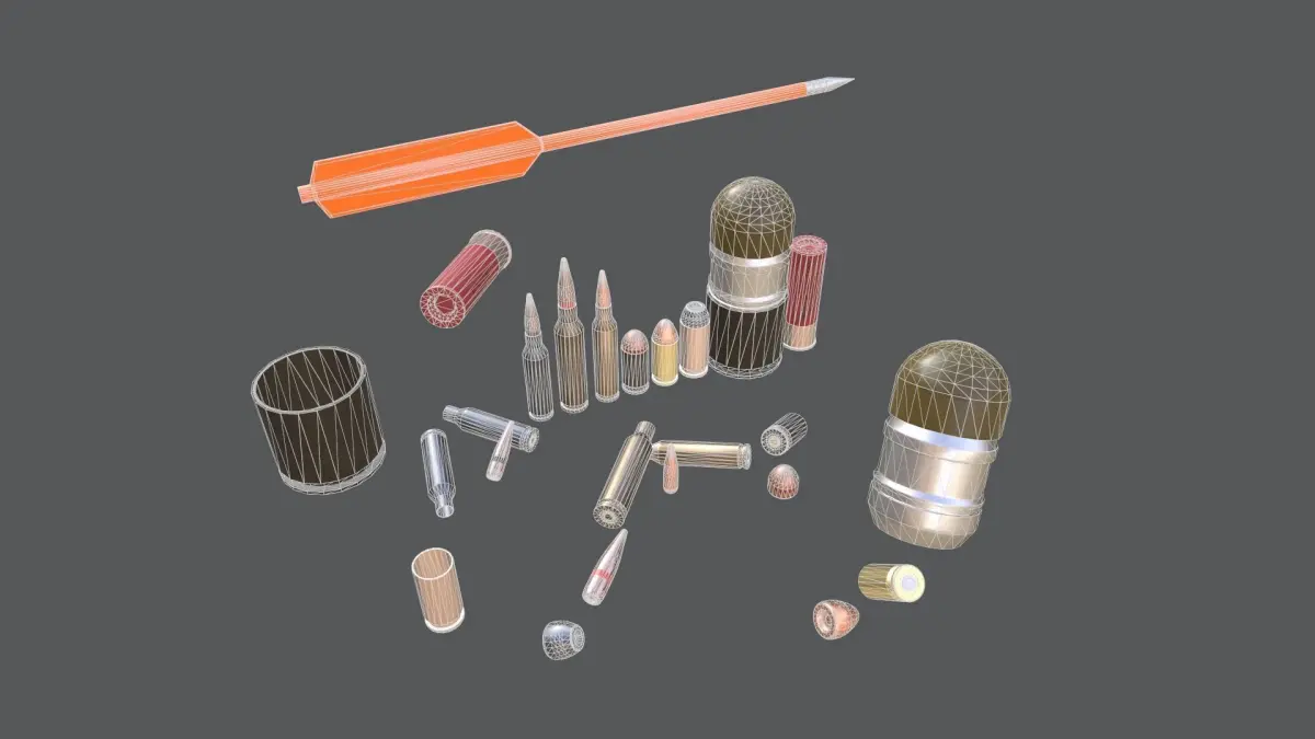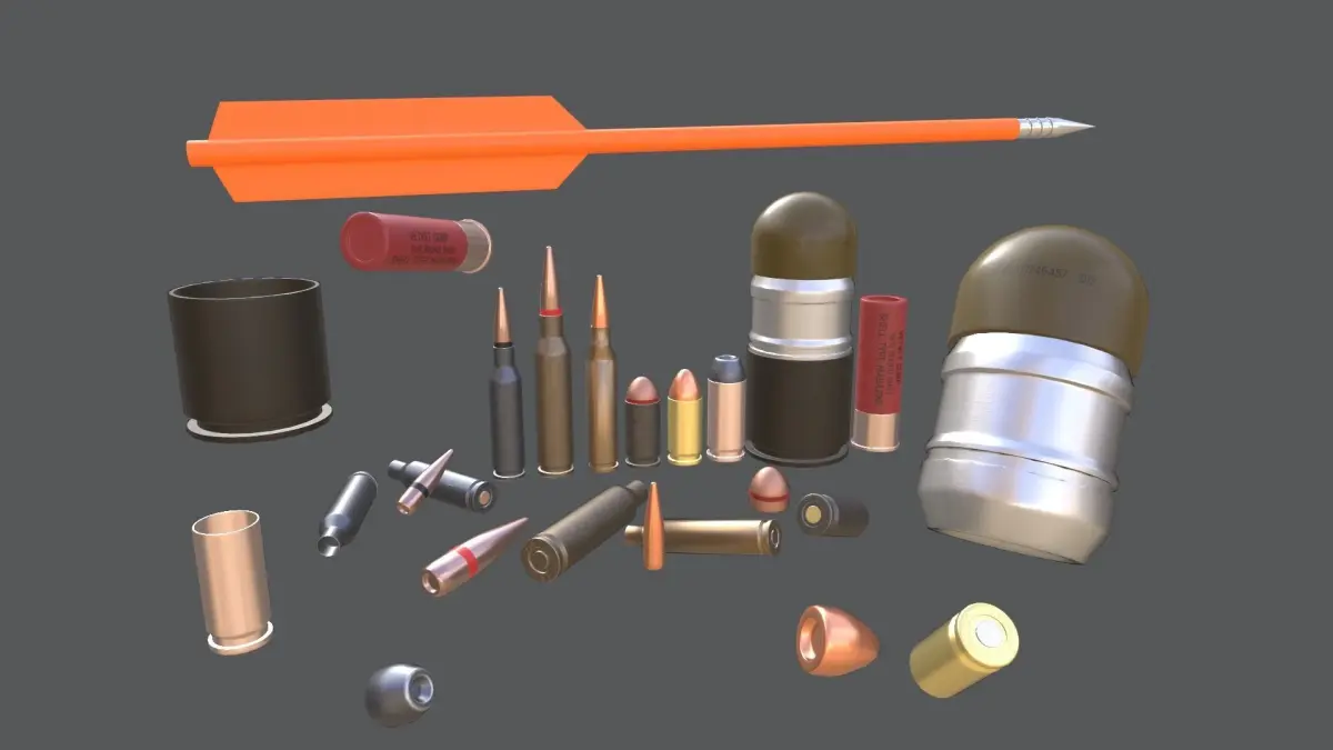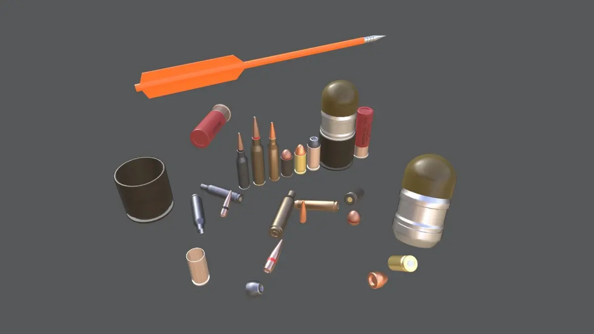 The ammo kit is completely ready to be loaded into the game engine. The kit includes cartridges of caliber 5.45, 5.56, 7, 62, 9mm, 0.44, 0.50, a 40 NATO caliber grenade shot, a crossbow bolt, shells and bullets are separate models, there are also high-poly models, a marmoset scene, materials PBR.