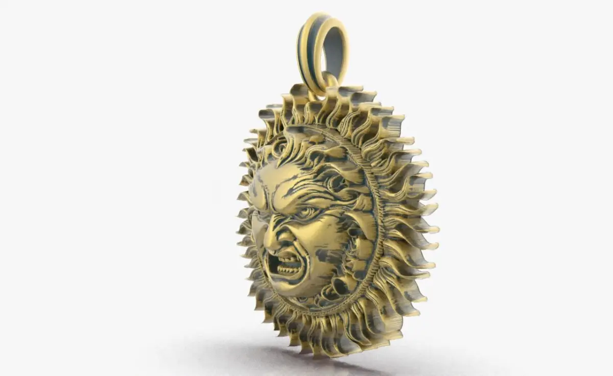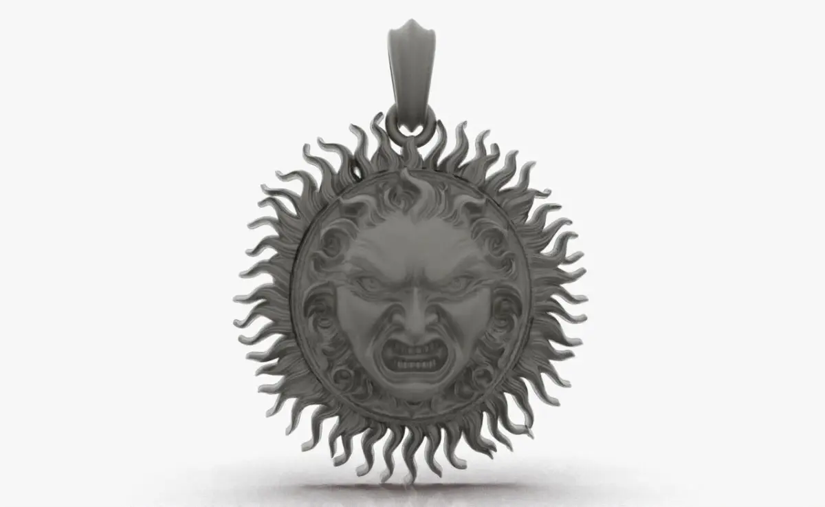 A pendant created in the shape of a radiant sun. At its center lies a polished, reflective surface resembling either a mirror or gleaming metal, serving as the heart of the design. Surrounding this are intricate, wavy sun rays, giving the piece a sense of motion and life. The pendant includes a loop at the top, suggesting it is designed to be worn as a necklace, exuding both elegance and symbolism making it possible to attach to a chain or cord. The Parameter are width 18.5mm/ length 20.5mm/ height 6.0mm .