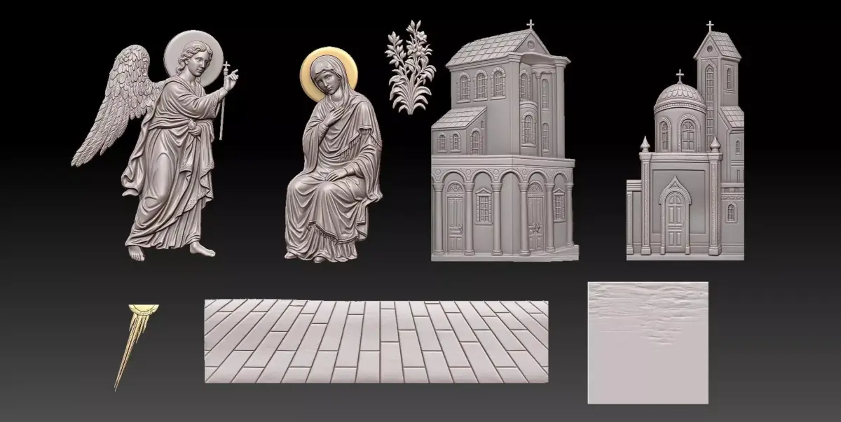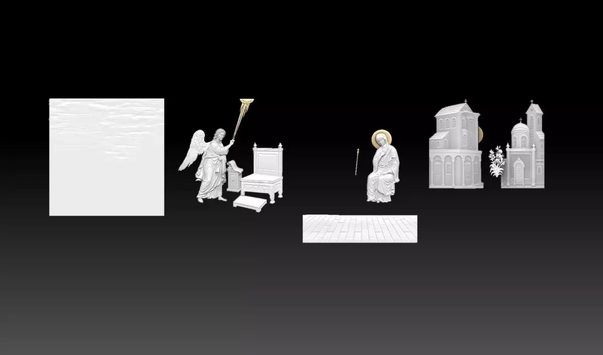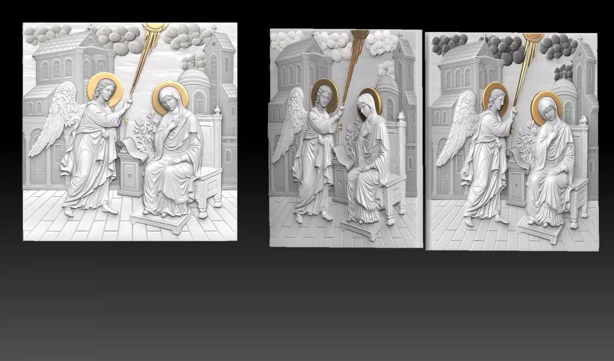 This product offers full flexibility for your projects. The download contains:Solid Version: The complete scene as a single, watertight mesh (Boolean union), ready for instant slicing and printing/carving.Modular Parts (ZIP): A folder containing the individual solid elements (~10-12 parts) separated.Includes: Angel Gabriel, Virgin Mary, Buildings, Floor, Rays, Clouds, Floral details, etc.Advantage: You can remove specific elements (e.g., hide the background buildings), rearrange the composition, or use the figures in different designs.Technical Specifications:Format: STL files (High-resolution).Optimization: Designed for precision CNC engraving and 3D printing (SLA/Resin recommended). The relief depth provides distinct shadows without deep undercuts.