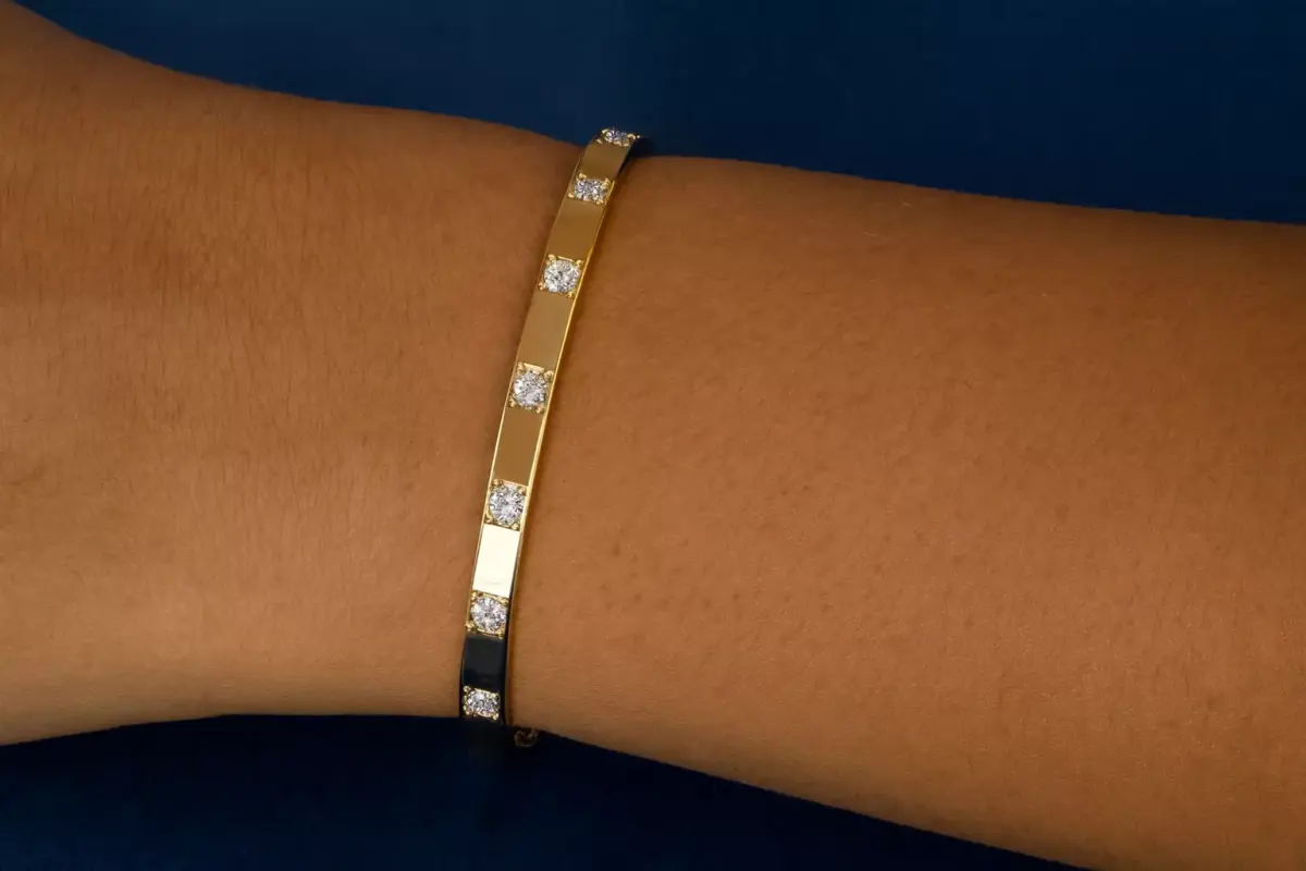 A timeless classic. The Aurora Bangle features brilliant, square-cut diamonds set elegantly within a polished gold-toned band. Designed for effortless wear, this piece brings a continuous, subtle sparkle that transitions beautifully from day to evening. Perfect for stacking or wearing as a striking, singular statement.