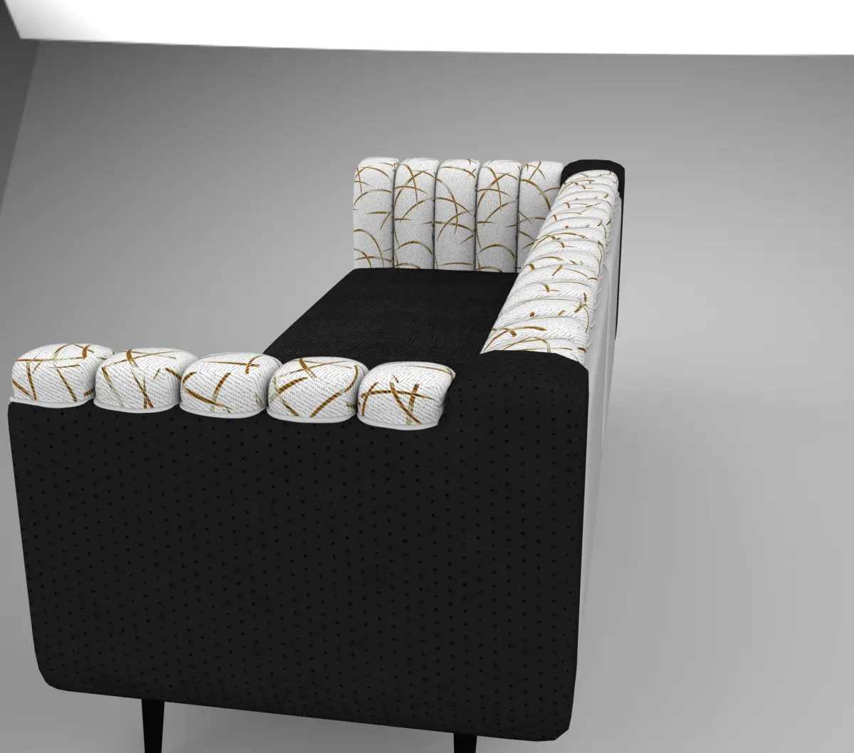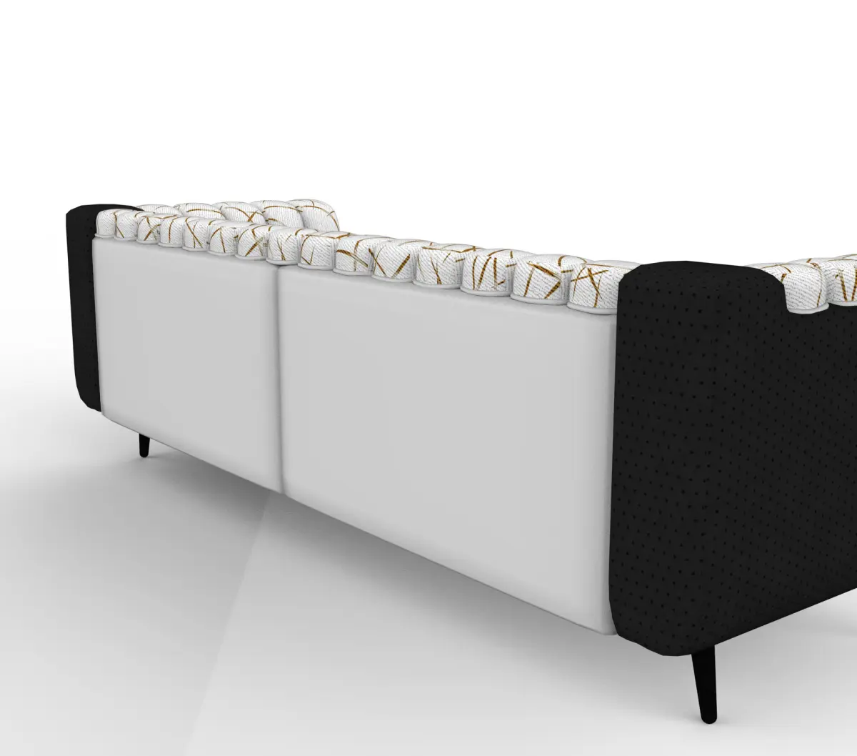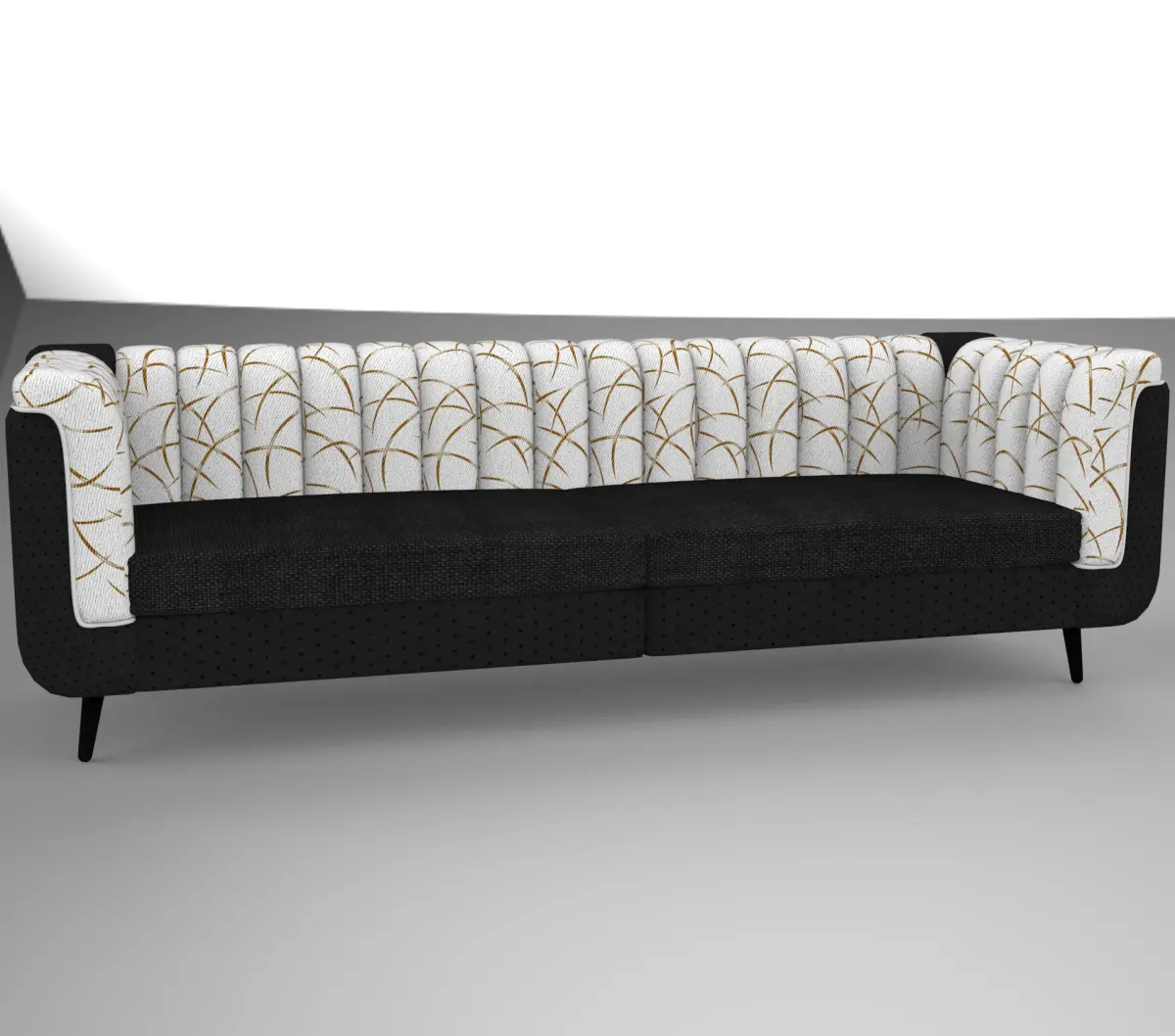 The Aurora Luxe Sofa is a contemporary and elegant piece of furniture, blending bold contrasts and subtle patterns. It features deep black fabric upholstery on the seat and outer frame, complemented by a plush, tufted backrest and arms in white fabric adorned with a delicate golden linear pattern reminiscent of abstract branches. The sofa stands on sleek black legs, giving it a floating appearance while maintaining a sturdy and sophisticated presence, perfect for modern or art-deco-inspired interiors.
