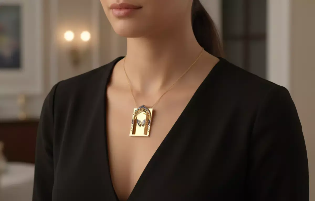 Inspired by architectural arches and the freedom of light, this necklace features a gold frame encrusted with gemstone accents. At its heart, a delicate butterfly rests within a golden gateway, symbolizing a journey toward transformation and inner peace.