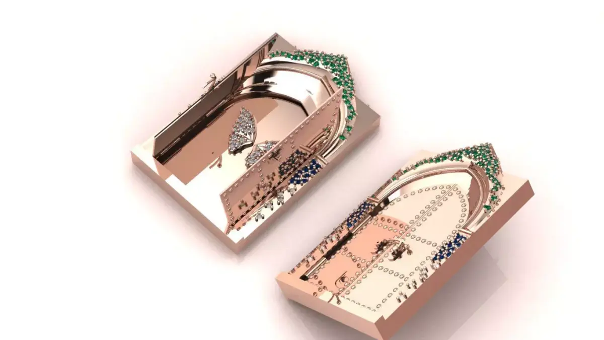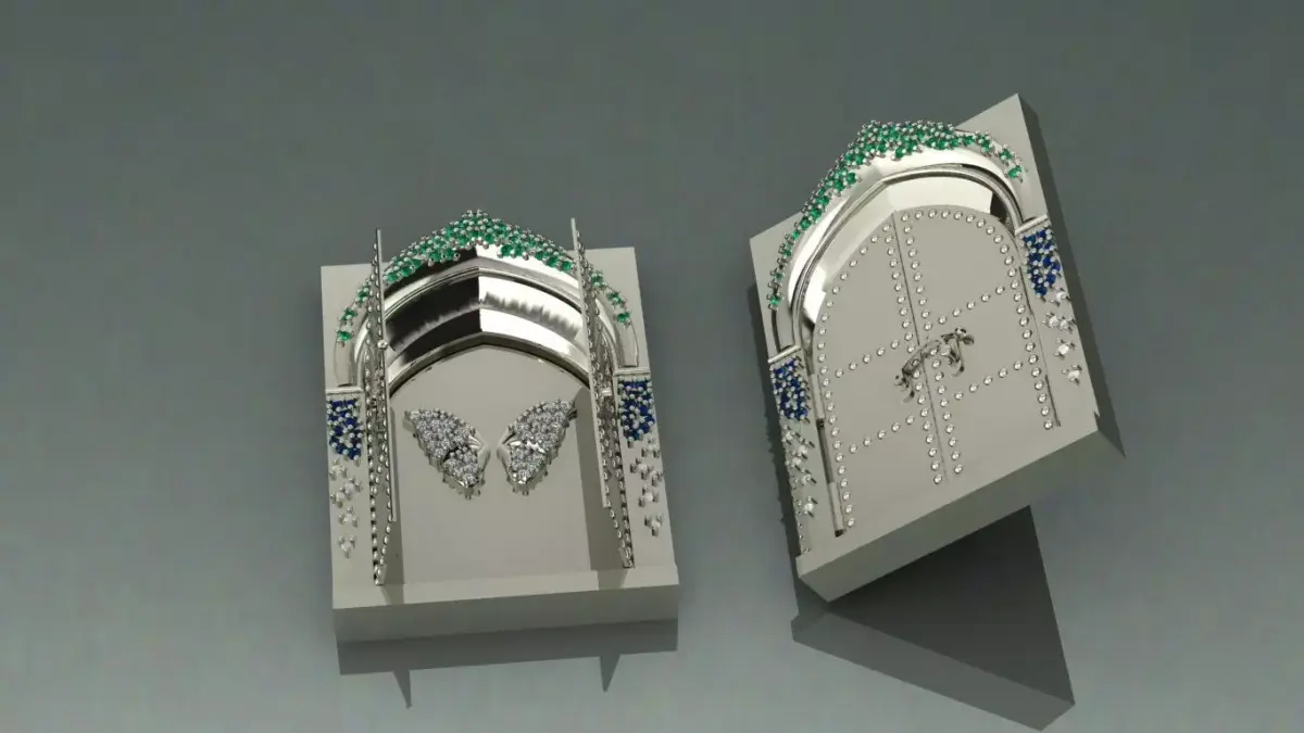 The model is available in 6 parts: Main jewelry piece + 2 doors + 1 lock mechanism - 2 Chain hooks