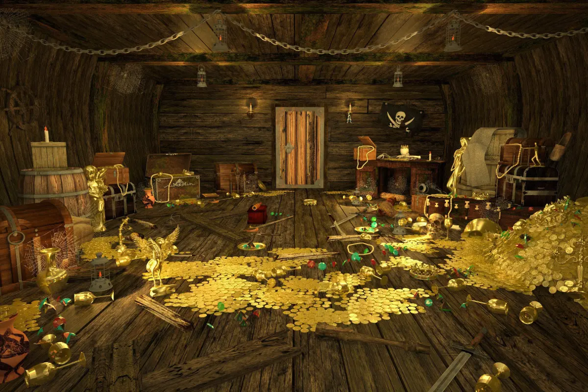 The scene is a cabin with a treasure of the pirate ship.The cabin treasure contains a lot of antiques pirate period.Details and interior corresponds to 16 - 18 centuries.The scene is perfect for game developers in the genre of hidden object and adventure.
