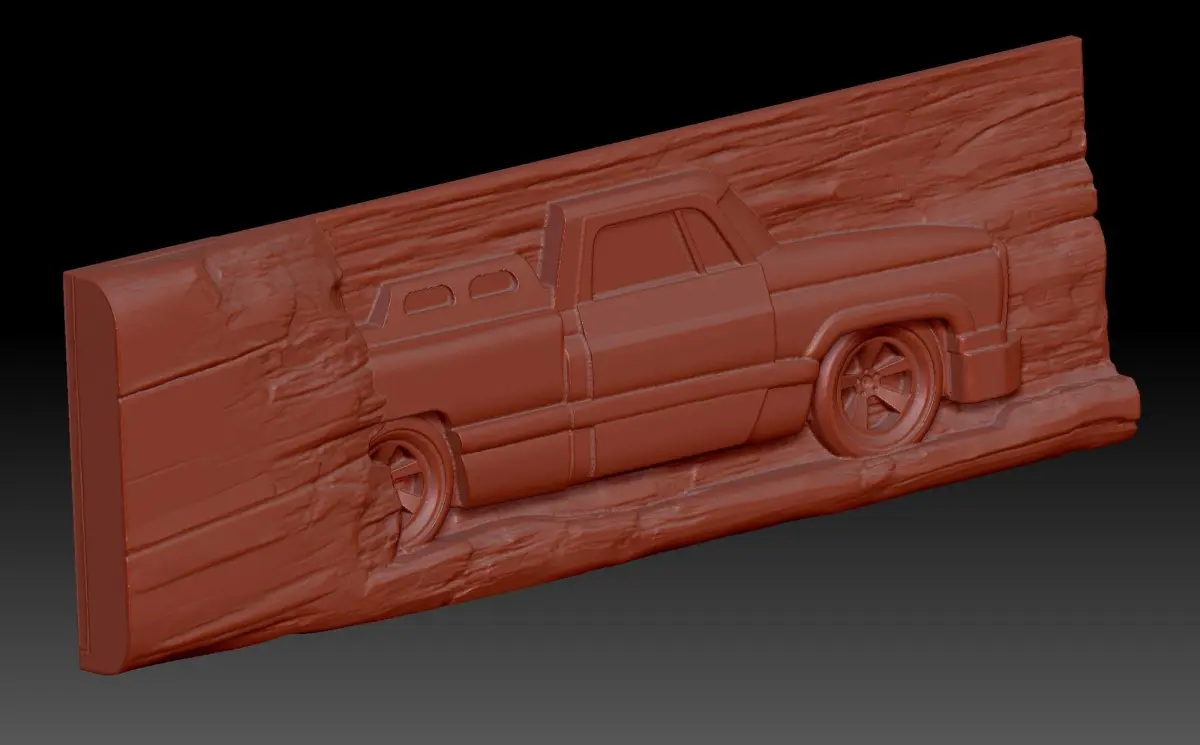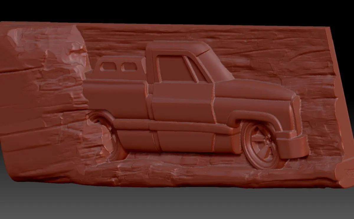 3d model of the bas-relief of the car. An interesting job due to the fact that the car is carved from wood, but incomplete. What gives the composition dynamics and speed. The whole composition is made in a rectangular shape.Suitable for CNC and 3D printing.