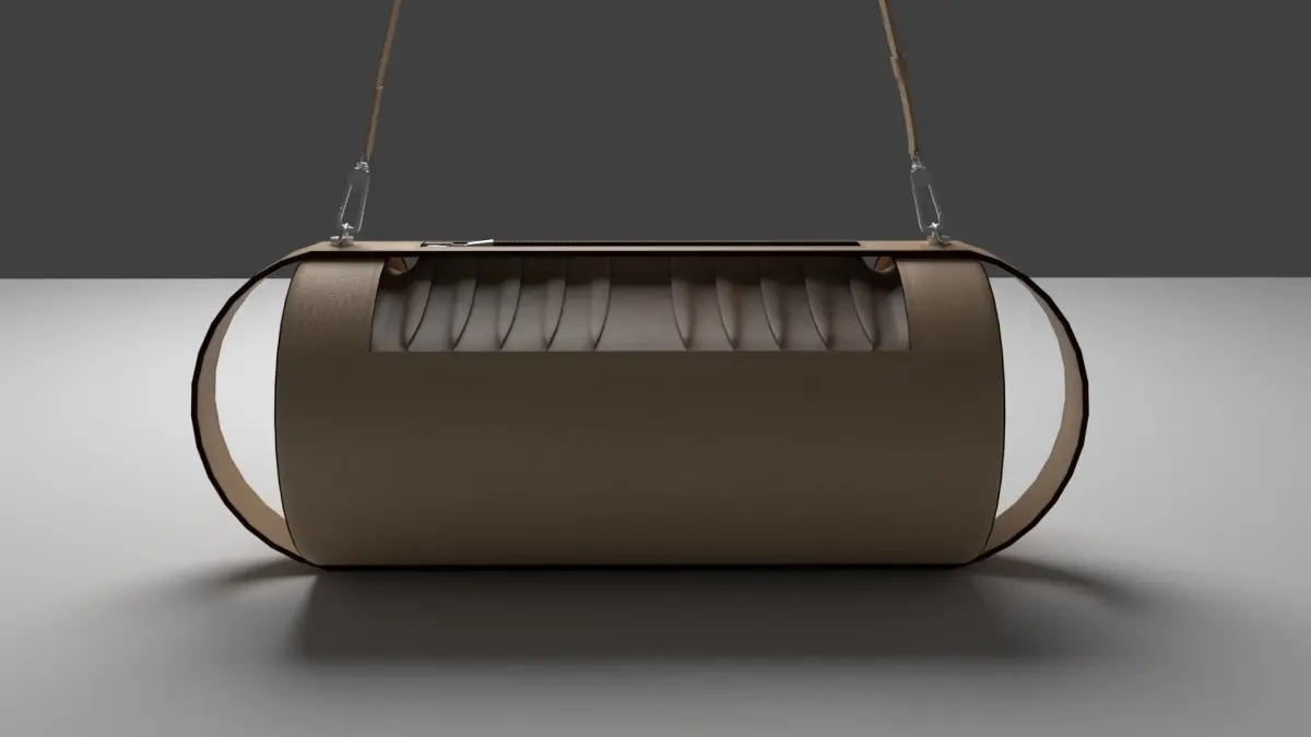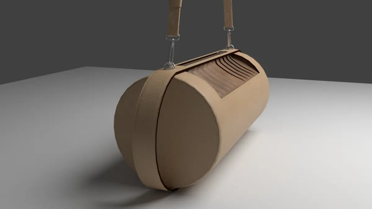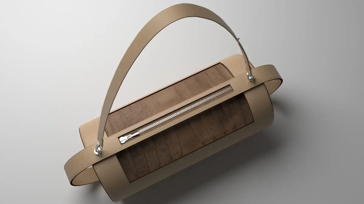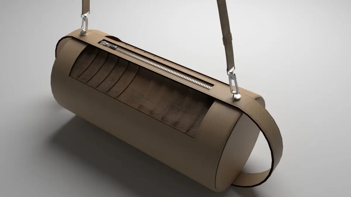 A beautiful cylindrical Handbag that will feast your eyes ! designed with all exterior details, it is made of beige leather, chrome metal parts. from the inside emerge a different leather part with folds that joins a kind of bridge on the top, then a zipper is laying on this bridge, giving this bag its charme and elegance but also a practical aspect, on each side there is a handle in case you want to carry the bag by hand.